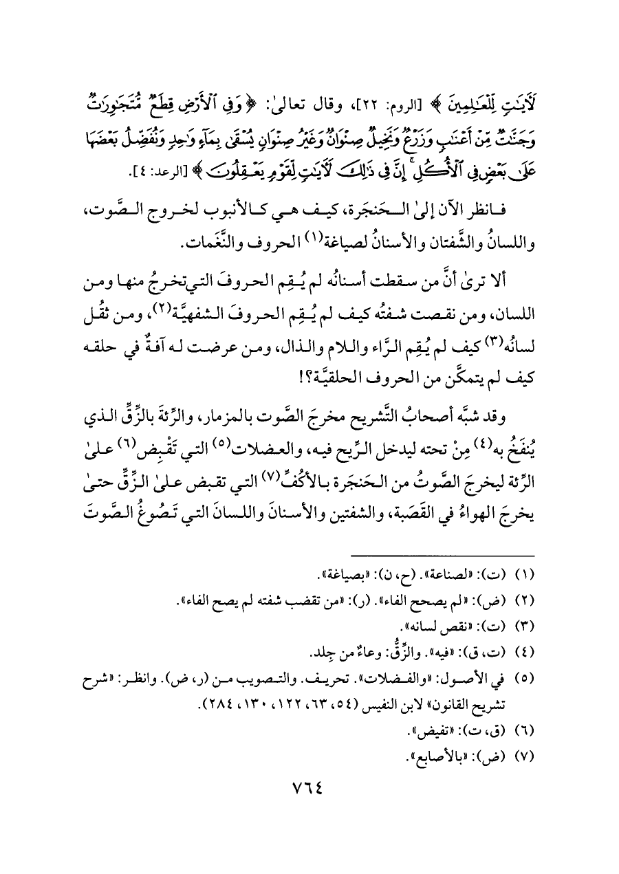 وقد شبَّه أصحابُ التَّشريح مخرجَ الصَّوت بالمزمار، والرِّئةَ بالزِّقِّ الذي يُنفَخُ به (¬٤) مِنْ تحته ليدخل الرِّيح فيه، والعضلات (¬٥) التي تَقْبِض (¬٦) على الرِّئة ليخرجَ الصَّوتُ من الحَنجَرة بالأكُفِّ (¬٧) التي تقبض على الزِّقِّ حتى يخرجَ الهواءُ في القَصَبة، والشفتين والأسنانَ واللسانَ التي تَصُوغُ الصَّوتَ