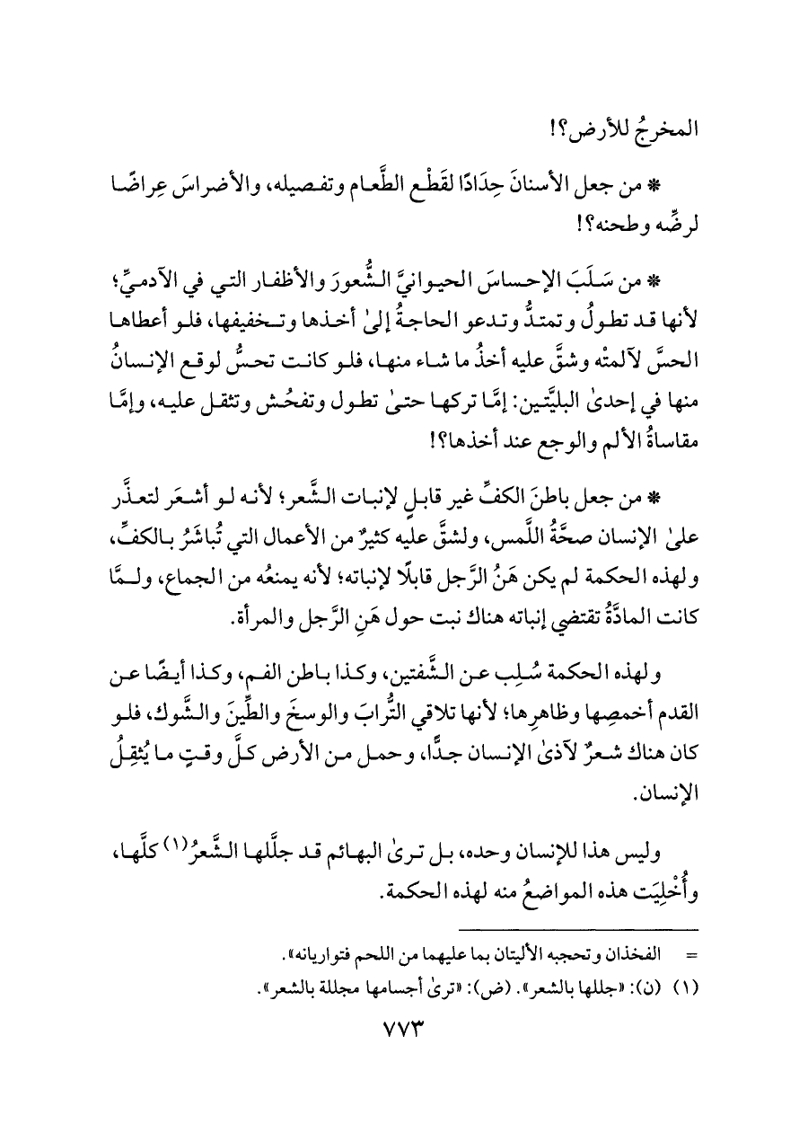 * من جعل باطنَ الكفِّ غير قابلٍ لإنبات الشَّعر؛ لأنه لو أشعَر لتعذَّر على الإنسان صحَّةُ اللَّمس، ولشقَّ عليه كثيرٌ من الأعمال التي تُباشَرُ بالكفِّ، ولهذه الحكمة لم يكن هَنُ الرَّجل قابلًا لإنباته؛ لأنه يمنعُه من الجماع، ولمَّا كانت المادَّةُ تقتضي إنباته هناك نبت حول هَنِ الرَّجل والمرأة.