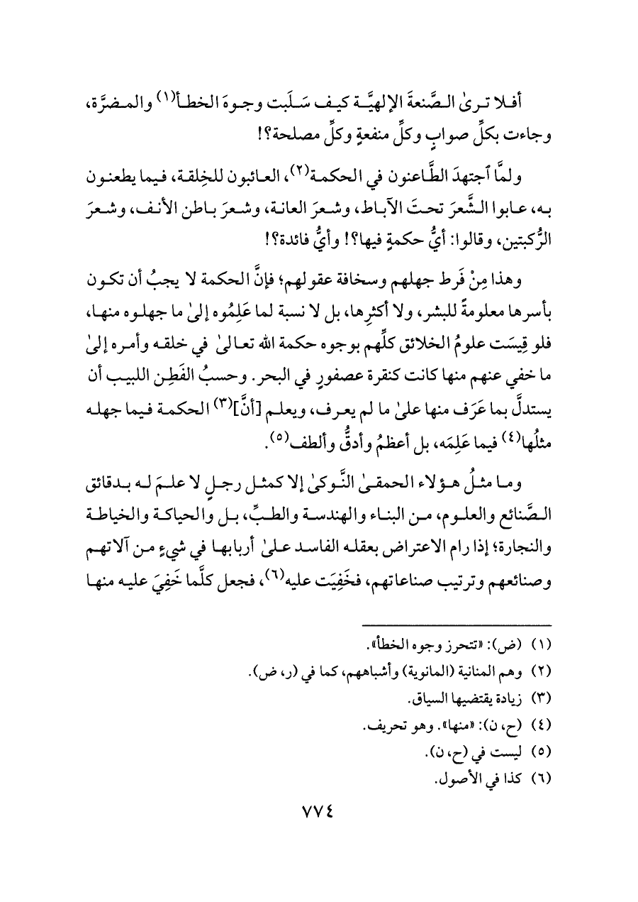 وهذا مِنْ فَرط جهلهم وسخافة عقولِهم؛ فإنَّ الحكمة لا يجبُ أن تكون بأسرها معلومةً للبشر، ولا أكثرِها، بل لا نسبة لما عَلِمُوه إلى ما جهلوه منها، فلو قِيسَت علومُ الخلائق كلِّهم بوجوه حكمة الله تعالى في خلقه وأمره إلى ما خفي عنهم منها كانت كنقرة عصفورٍ في البحر. وحسبُ الفَطِن اللبيب أن يستدلَّ بما عَرَف منها على ما لم يعرف، ويعلم [أنَّ] (¬٣) الحكمة فيما جهله مثلُها (¬٤) فيما عَلِمَه، بل أعظمُ وأدقُّ وألطف (¬٥).