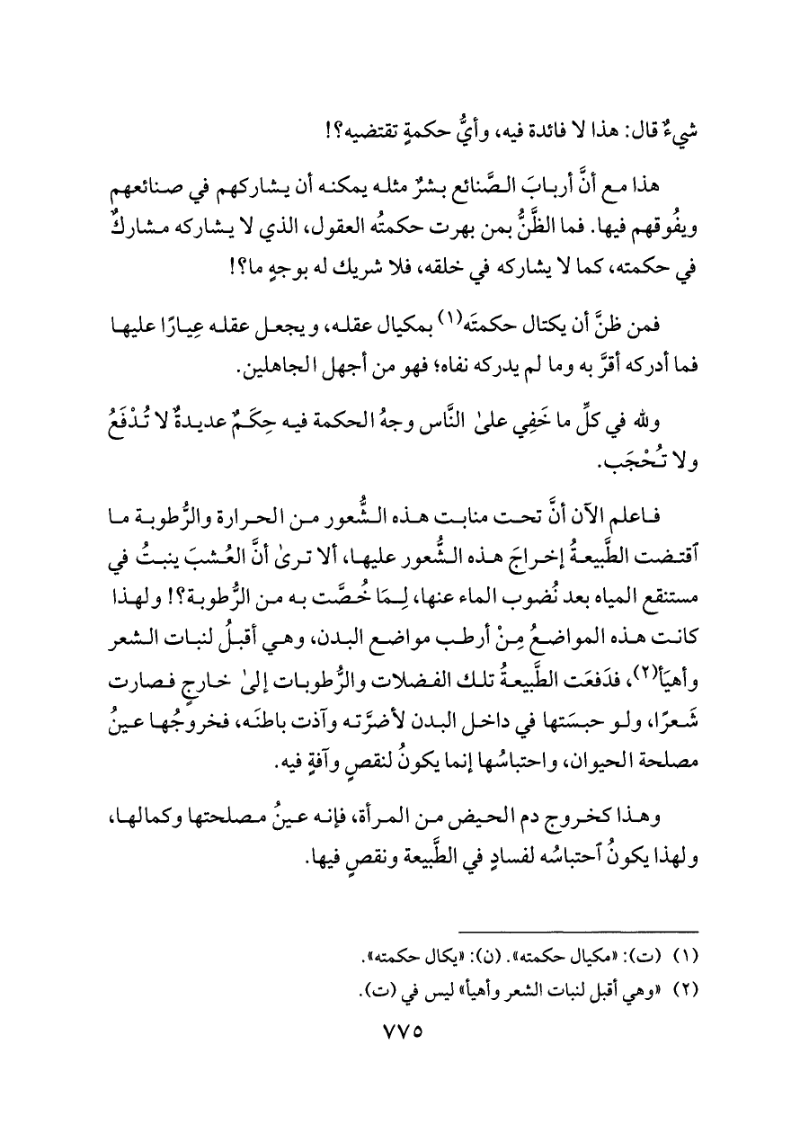 فاعلم الآن أنَّ تحت منابت هذه الشُّعور من الحرارة والرُّطوبة ما اقتضت الطَّبيعةُ إخراجَ هذه الشُّعور عليها، ألا ترى أنَّ العُشبَ ينبتُ في مستنقع المياه بعد نُضوب الماء عنها، لِمَا خُصَّت به من الرُّطوبة؟! ولهذا كانت هذه المواضعُ مِنْ أرطب مواضع البدن، وهي أقبلُ لنبات الشعر وأهيَأ (¬٢)، فدَفعَت الطَّبيعةُ تلك الفضلات والرُّطوبات إلى خارجٍ فصارت شَعرًا، ولو حبسَتها في داخل البدن لأضرَّته وآذت باطنَه، فخروجُها عينُ مصلحة الحيوان، واحتباسُها إنما يكونُ لنقصٍ وآفةٍ فيه.