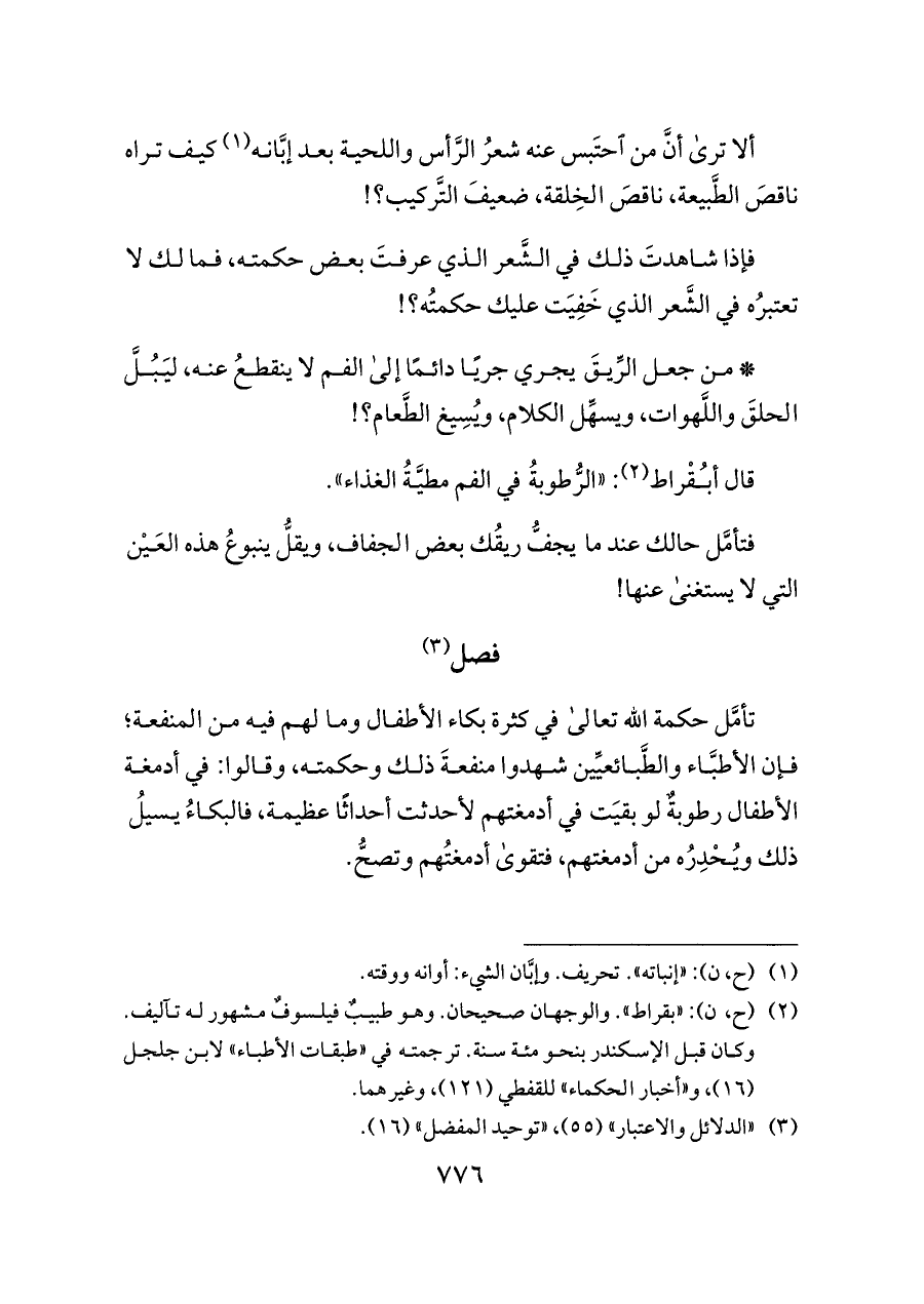 تأمَّل حكمة الله تعالى في كثرة بكاء الأطفال وما لهم فيه من المنفعة؛ فإن الأطبَّاء والطَّبائعيِّين شهدوا منفعةَ ذلك وحكمته، وقالوا: في أدمغة الأطفال رطوبةٌ لو بقيَت في أدمغتهم لأحدثت أحداثًا عظيمة، فالبكاءُ يسيلُ ذلك ويُحْدِرُه من أدمغتهم، فتقوى أدمغتُهم وتصحُّ.