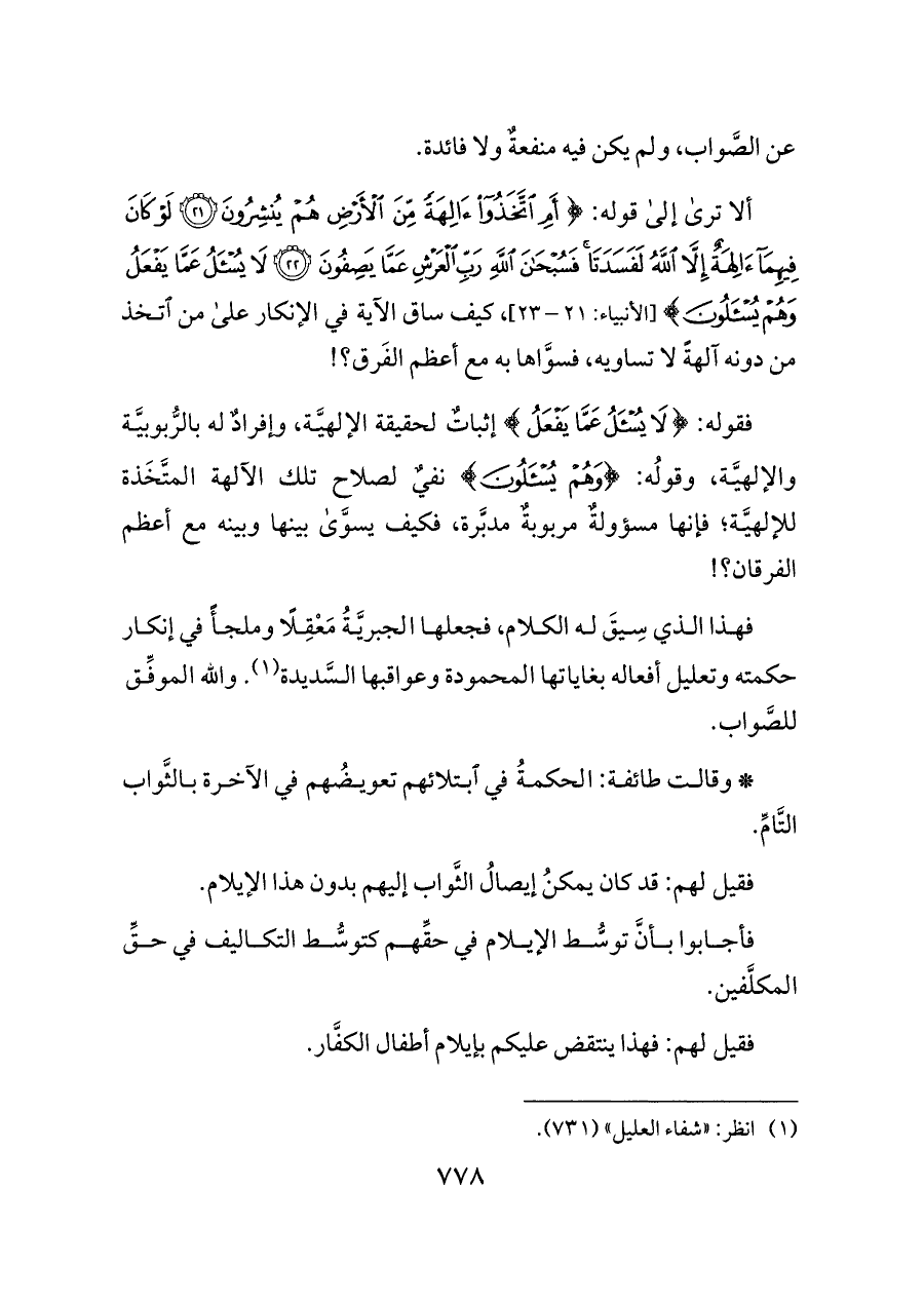 فهذا الذي سِيقَ له الكلام، فجعلها الجبريَّةُ مَعْقِلًا وملجأً في إنكار حكمته وتعليل أفعاله بغاياتها المحمودة وعواقبها السَّديدة (¬١). والله الموفِّق للصَّواب.