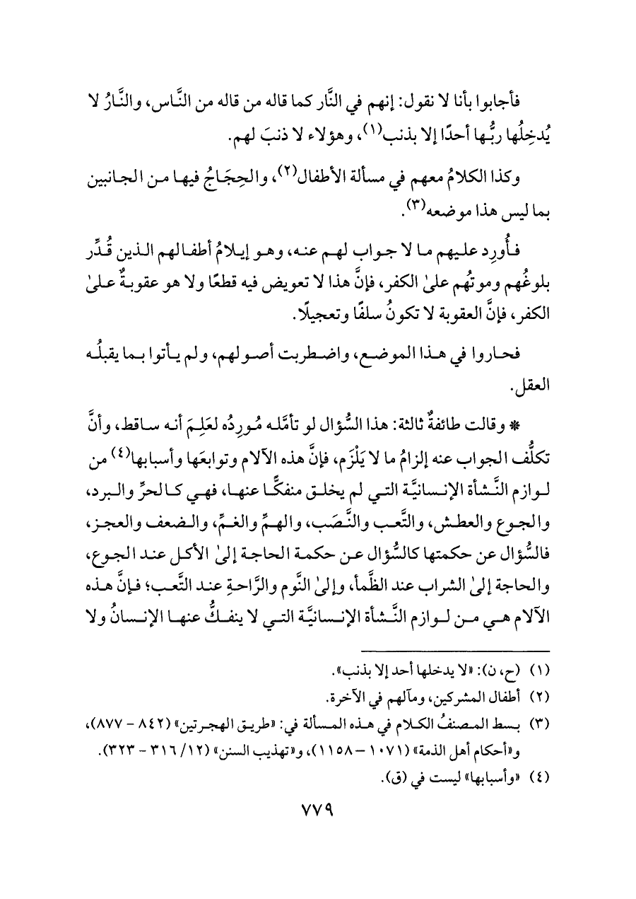فأجابوا بأنا لا نقول: إنهم في النَّار كما قاله من قاله من النَّاس، والنَّارُ لا يُدخِلُها ربُّها أحدًا إلا بذنب (¬١)، وهؤلاء لا ذنبَ لهم.
