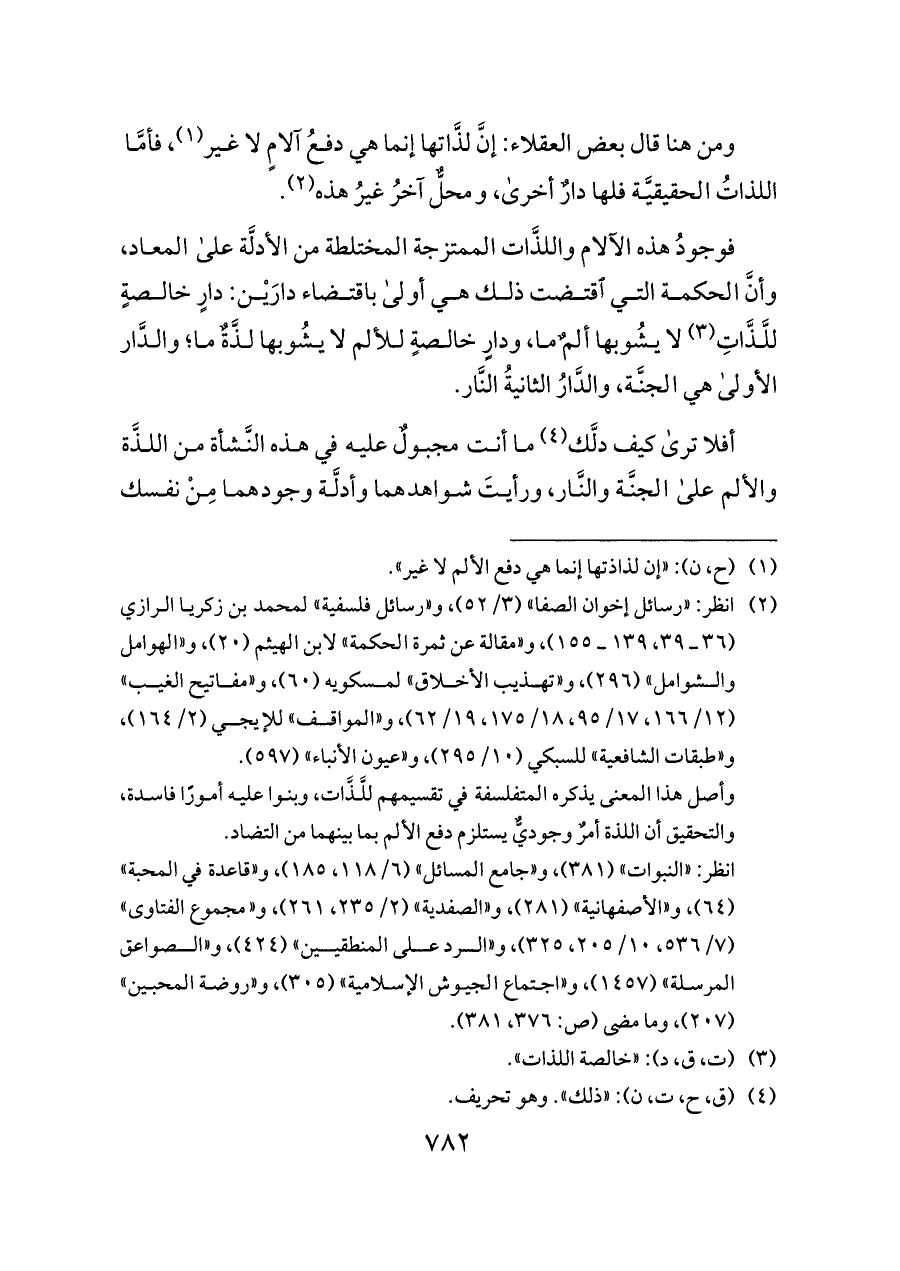 (¬٢) انظر: «رسائل إخوان الصفا» (٣/ ٥٢)، و «رسائل فلسفية» لمحمد بن زكريا الرازي (٣٦ ــ ٣٩، ١٣٩ ــ ١٥٥)، و «مقالة عن ثمرة الحكمة» لابن الهيثم (٢٠)، و «الهوامل والشوامل» (٢٩٦)، و «تهذيب الأخلاق» لمسكويه (٦٠)، و «مفاتيح الغيب» (١٢/ ١٦٦، ١٧/ ٩٥، ١٨/ ١٧٥، ١٩/ ٦٢)، و «المواقف» للإيجي (٢/ ١٦٤)، و «طبقات الشافعية» للسبكي (١٠/ ٢٩٥)، و «عيون الأنباء» (٥٩٧).