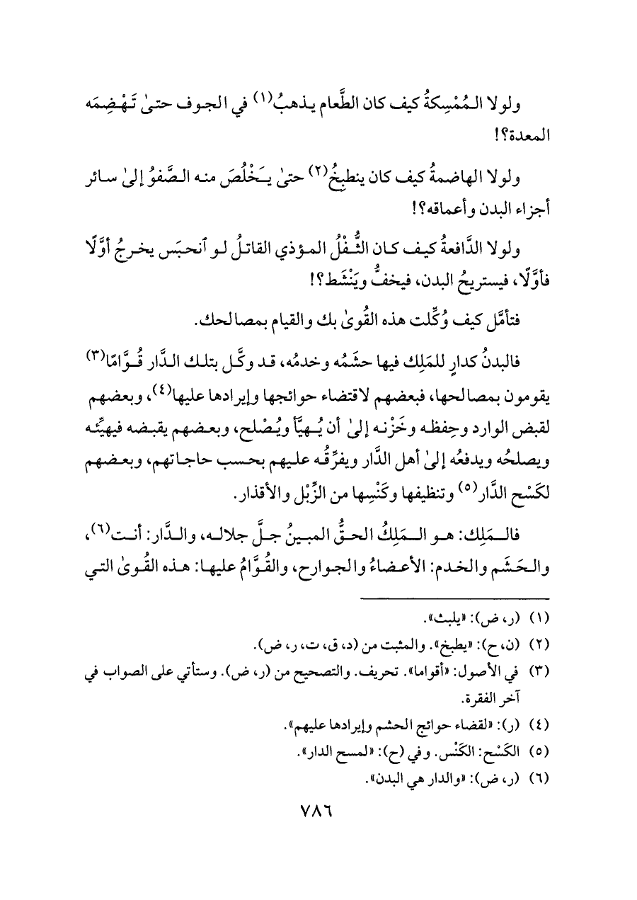 فالبدنُ كدارٍ للمَلِك فيها حشَمُه وخدمُه، قد وكَّل بتلك الدَّار قُوَّامًا (¬٣) يقومون بمصالحها، فبعضهم لاقتضاء حوائجها وإيرادها عليها (¬٤)، وبعضهم لقبض الوارد وحِفظه وخَزْنه إلى أن يُهيَّأ ويُصْلح، وبعضهم يقبضه فيهيِّئه ويصلحُه ويدفعُه إلى أهل الدَّار ويفرِّقُه عليهم بحسب حاجاتهم، وبعضهم لكَسْح الدَّار (¬٥) وتنظيفها وكَنْسِها من الزِّبْل والأقذار.