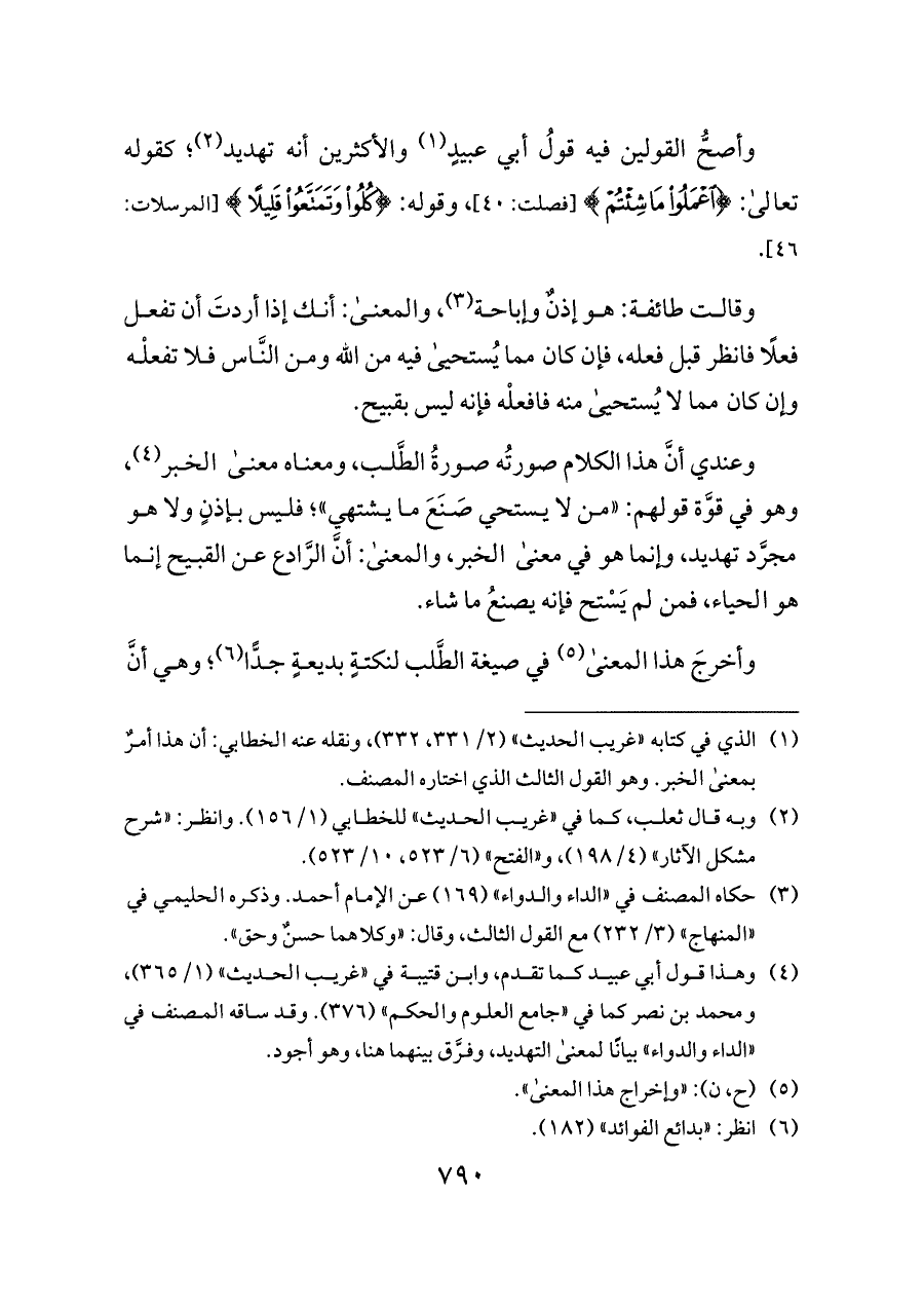 وعندي أنَّ هذا الكلام صورتُه صورةُ الطَّلب، ومعناه معنى الخبر (¬٤)، وهو في قوَّة قولهم: «من لا يستحي صَنَعَ ما يشتهي»؛ فليس بإذنٍ ولا هو مجرَّد تهديد، وإنما هو في معنى الخبر، والمعنى: أنَّ الرَّادع عن القبيح إنما هو الحياء، فمن لم يَسْتح فإنه يصنعُ ما شاء.