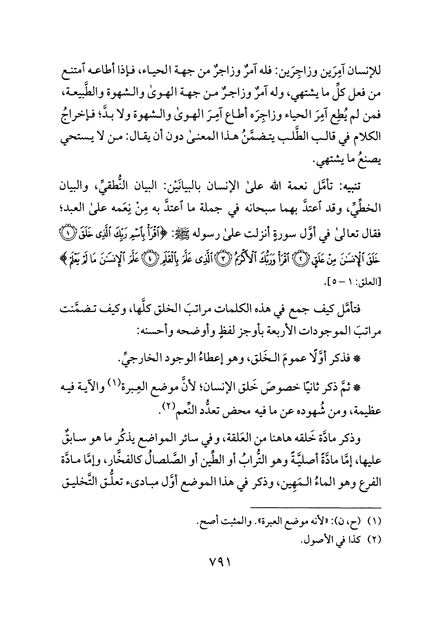 تنبيه: تأمَّل نعمة الله على الإنسان بالبيانَيْن: البيان النُّطقيِّ، والبيان الخطِّيِّ، وقد اعتدَّ بهما سبحانه في جملة ما اعتدَّ به مِنْ نِعَمه على العبد؛ فقال تعالى في أوَّل سورةٍ أنزلت على رسوله - صلى الله عليه وسلم -: {اقْرَأْ بِاسْمِ رَبِّكَ الَّذِي خَلَقَ (١) خَلَقَ الْإِنْسَانَ مِنْ عَلَقٍ (٢) اقْرَأْ وَرَبُّكَ الْأَكْرَمُ (٣) الَّذِي عَلَّمَ بِالْقَلَمِ (٤) عَلَّمَ الْإِنْسَانَ مَا لَمْ يَعْلَمْ} [العلق: ١ - ٥].