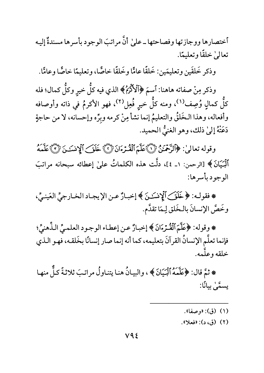 وقوله تعالى: {الرَّحْمَنُ (١) عَلَّمَ الْقُرْآنَ (٢) خَلَقَ الْإِنْسَانَ (٣) عَلَّمَهُ الْبَيَانَ} [الرحمن: ١ ــ ٤]، دلَّت هذه الكلماتُ على إعطائه سبحانه مراتبَ الوجود بأسرها: