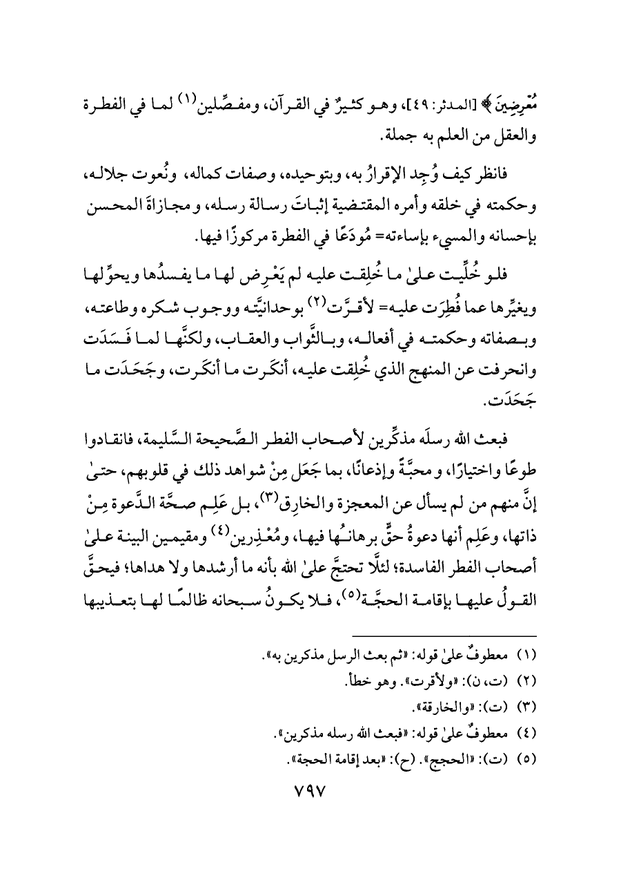 مُعْرِضِينَ} [المدثر: ٤٩]، وهو كثيرٌ في القرآن، ومفصِّلين (¬١) لما في الفطرة والعقل من العلم به جملة.