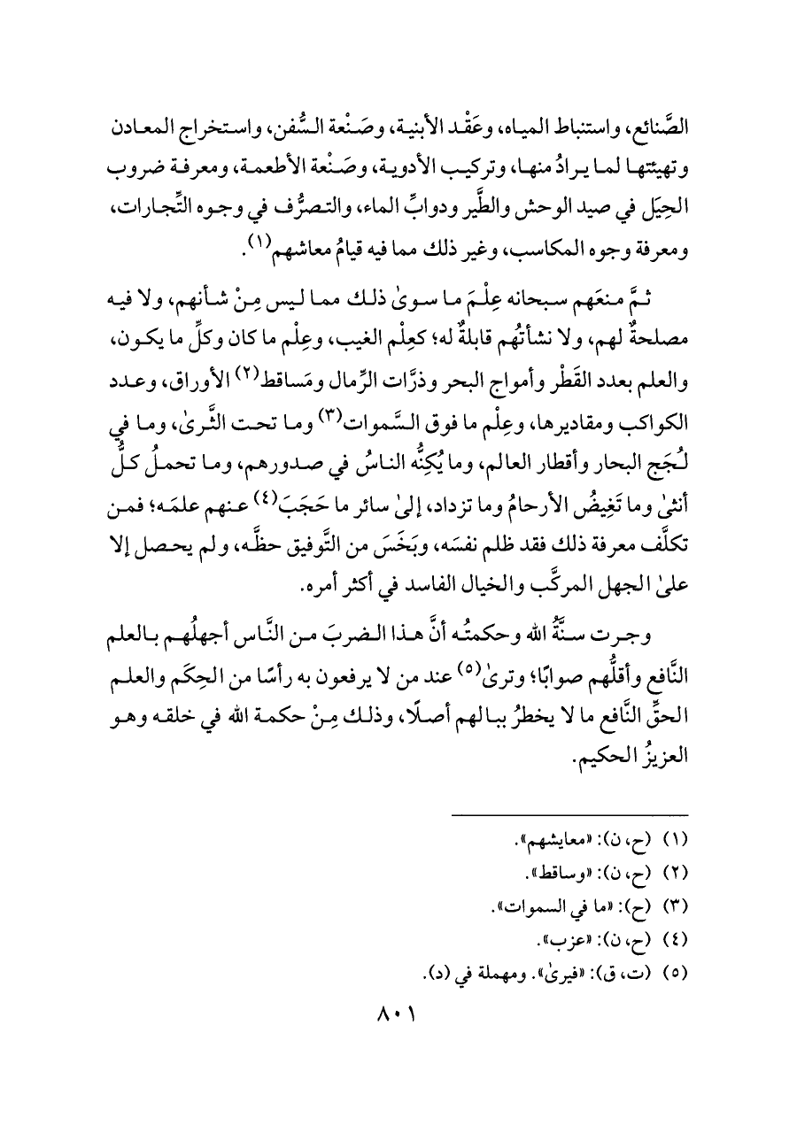 ثمَّ منعَهم سبحانه عِلْمَ ما سوى ذلك مما ليس مِنْ شأنهم، ولا فيه مصلحةٌ لهم، ولا نشأتُهم قابلةٌ له؛ كعِلْم الغيب، وعِلْم ما كان وكلِّ ما يكون، والعلم بعدد القَطْر وأمواج البحر وذرَّات الرِّمال ومَساقط (¬٢) الأوراق، وعدد الكواكب ومقاديرها، وعِلْم ما فوق السَّموات (¬٣) وما تحت الثَّرى، وما في لُجَج البحار وأقطار العالم، وما يُكِنُّه الناسُ في صدورهم، وما تحملُ كلُّ أنثى وما تَغِيضُ الأرحامُ وما تزداد، إلى سائر ما حَجَبَ (¬٤) عنهم علمَه؛ فمن تكلَّف معرفة ذلك فقد ظلم نفسَه، وبَخَسَ من التَّوفيق حظَّه، ولم يحصل إلا على الجهل المركَّب والخيال الفاسد في أكثر أمره.