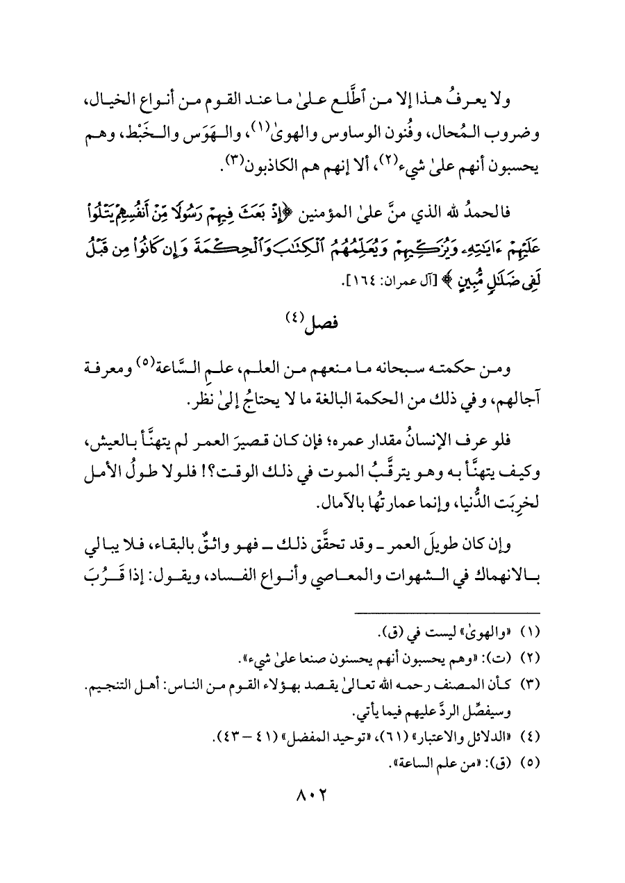 ومن حكمته سبحانه ما منعهم من العلم، علمِ السَّاعة (¬٥) ومعرفة آجالهم، وفي ذلك من الحكمة البالغة ما لا يحتاجُ إلى نظر.