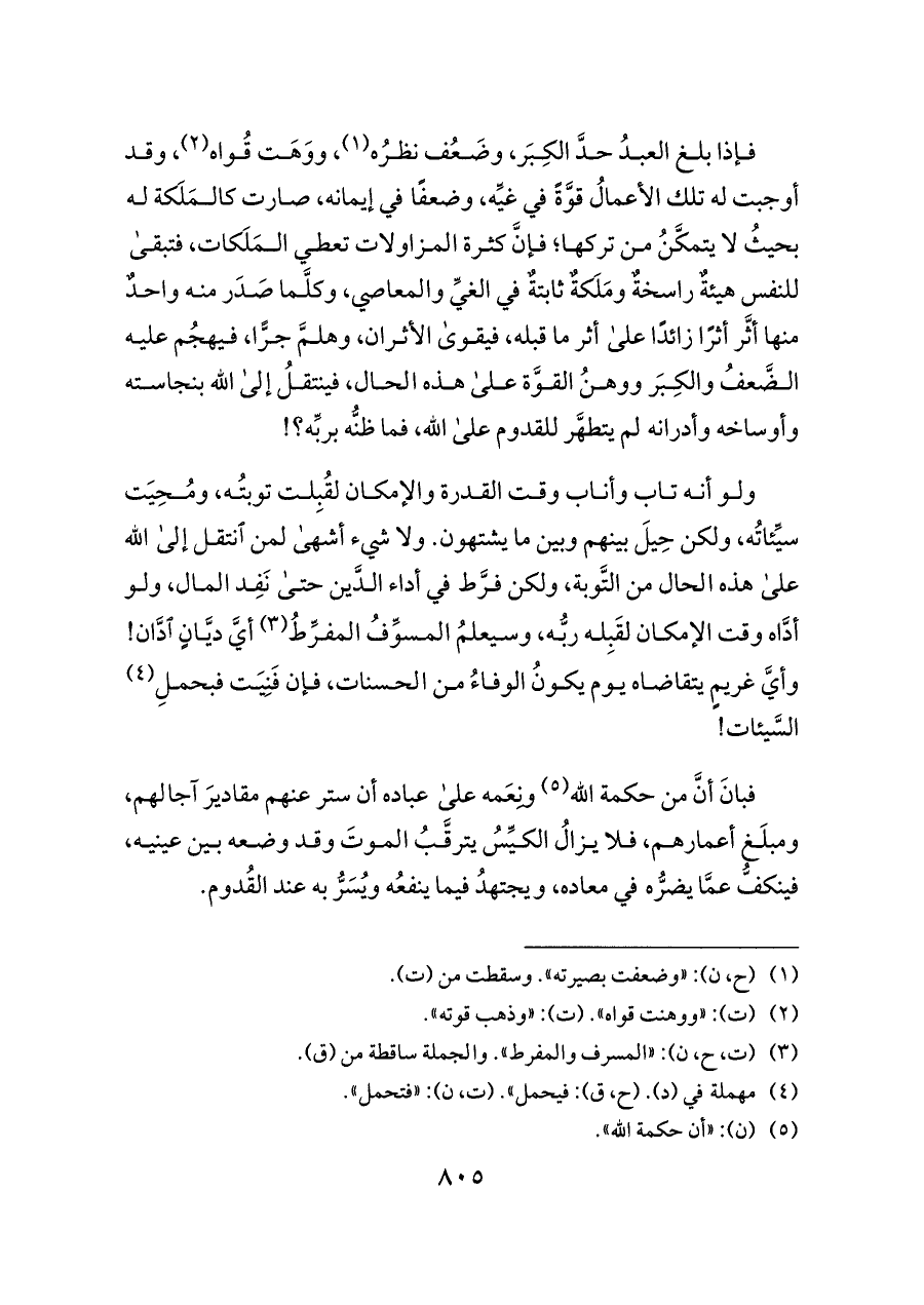 فإذا بلغ العبدُ حدَّ الكِبَر، وضَعُف نظرُه (¬١)، ووَهَت قُواه (¬٢)، وقد أوجبت له تلك الأعمالُ قوَّةً في غيِّه، وضعفًا في إيمانه، صارت كالمَلَكة له بحيثُ لا يتمكَّنُ من تركها؛ فإنَّ كثرة المزاولات تعطي المَلَكات، فتبقى للنفس هيئةٌ راسخةٌ ومَلَكةٌ ثابتةٌ في الغيِّ والمعاصي، وكلَّما صَدَر منه واحدٌ منها أثَّر أثرًا زائدًا على أثر ما قبله، فيقوى الأثران، وهلمَّ جرًّا، فيهجُم عليه الضَّعفُ والكِبَر ووهنُ القوَّة على هذه الحال، فينتقلُ إلى الله بنجاسته وأوساخه وأدرانه لم يتطهَّر للقدوم على الله، فما ظنُّه بربِّه؟!