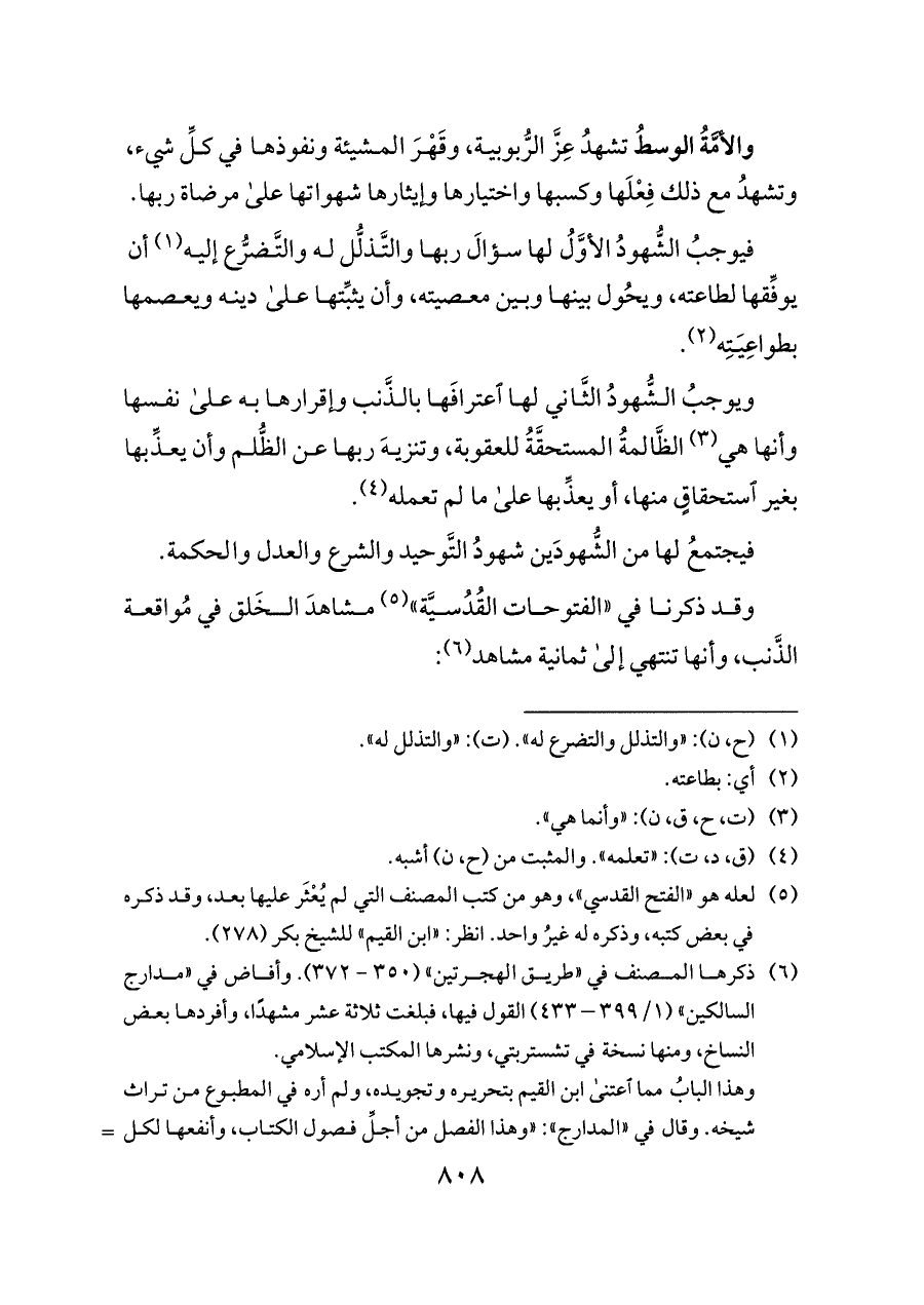 والأمَّةُ الوسطُ تشهدُ عِزَّ الرُّبوبية، وقَهْرَ المشيئة ونفوذها في كلِّ شيء، وتشهدُ مع ذلك فِعْلَها وكسبها واختيارها وإيثارها شهواتها على مرضاة ربها.