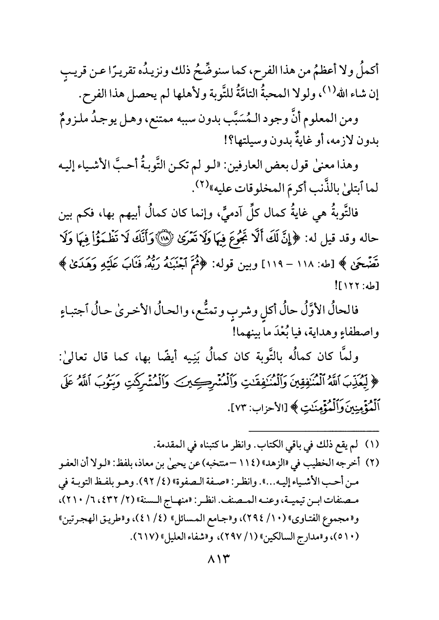 ولمَّا كان كمالُه بالتَّوبة كان كمالُ بَنِيه أيضًا بها، كما قال تعالى: {لِيُعَذِّبَ اللَّهُ الْمُنَافِقِينَ وَالْمُنَافِقَاتِ وَالْمُشْرِكِينَ وَالْمُشْرِكَاتِ وَيَتُوبَ اللَّهُ عَلَى الْمُؤْمِنِينَ وَالْمُؤْمِنَاتِ} [الأحزاب: ٧٣].
