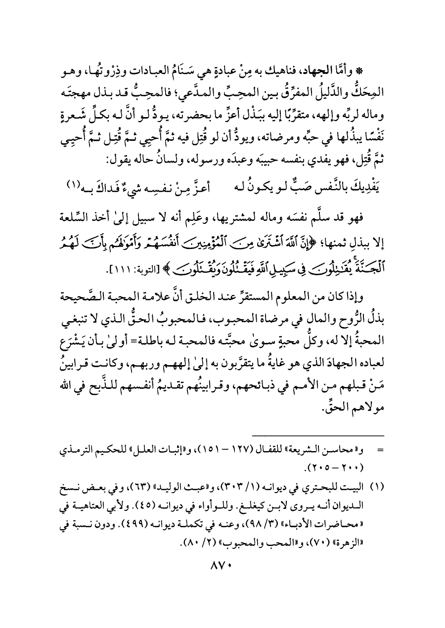 وإذا كان من المعلوم المستقرِّ عند الخلق أنَّ علامة المحبة الصَّحيحة بذلُ الرُّوح والمال في مرضاة المحبوب، فالمحبوبُ الحقُّ الذي لا تنبغي المحبةُ إلا له، وكلُّ محبةٍ سوى محبَّته فالمحبة له باطلة= أولى بأن يَشْرَع لعباده الجهادَ الذي هو غايةُ ما يتقرَّبون به إلى إلههم وربهم، وكانت قرابينُ مَنْ قبلهم من الأمم في ذبائحهم، وقرابينُهم تقديمُ أنفسهم للذَّبح في الله مولاهم الحقِّ.