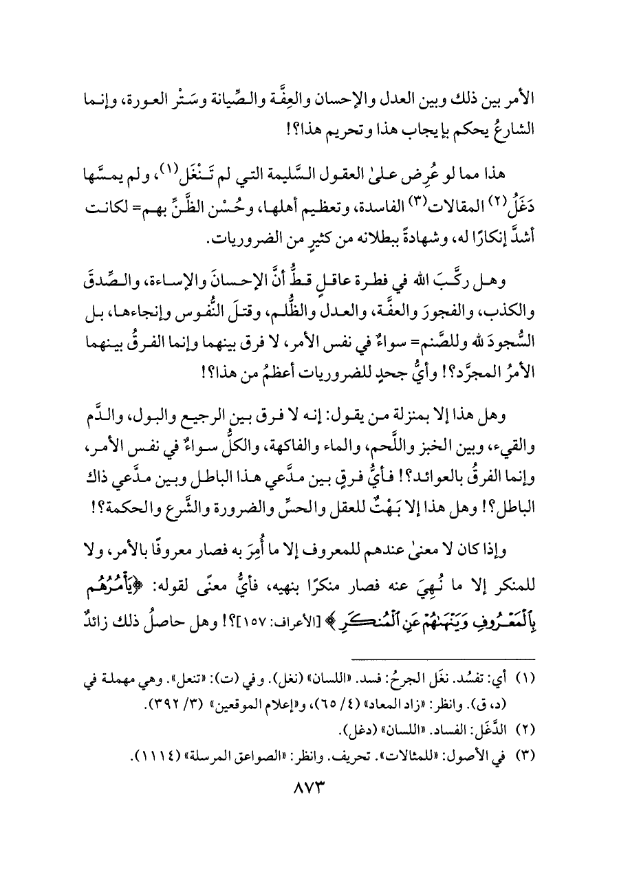 وهل ركَّبَ الله في فطرة عاقلٍ قطُّ أنَّ الإحسانَ والإساءة، والصِّدقَ والكذب، والفجورَ والعفَّة، والعدل والظُّلم، وقتلَ النُّفوس وإنجاءها، بل السُّجودَ لله وللصَّنم= سواءٌ في نفس الأمر، لا فرق بينهما وإنما الفرقُ بينهما الأمرُ المجرَّد؟! وأيُّ جحدٍ للضروريات أعظمُ من هذا؟!