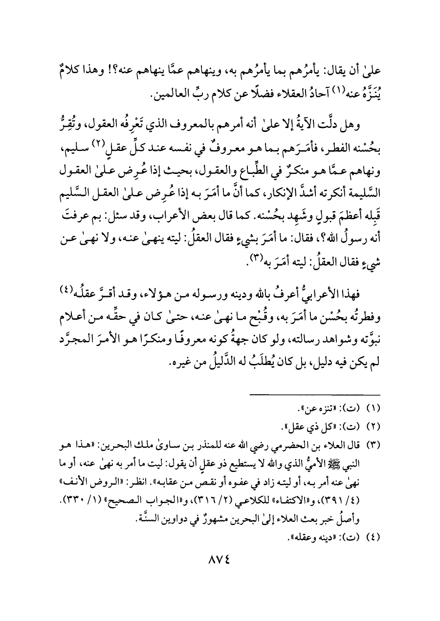 وهل دلَّت الآيةُ إلا على أنه أمرهم بالمعروف الذي تَعْرِفُه العقول، وتُقِرُّ بحُسْنه الفطر، فأمَرَهم بما هو معروفٌ في نفسه عند كلِّ عقلٍ (¬٢) سليم، ونهاهم عمَّا هو منكرٌ في الطِّباع والعقول، بحيث إذا عُرِض على العقول السَّليمة أنكرته أشدَّ الإنكار، كما أنَّ ما أمَرَ به إذا عُرِض على العقل السَّليم قَبِله أعظمَ قبولٍ وشَهِد بحُسْنه. كما قال بعض الأعراب، وقد سئل: بم عرفتَ أنه رسولُ الله؟، فقال: ما أمَرَ بشيءٍ فقال العقلُ: ليته ينهى عنه، ولا نهى عن شيءٍ فقال العقلُ: ليته أمَرَ به (¬٣).