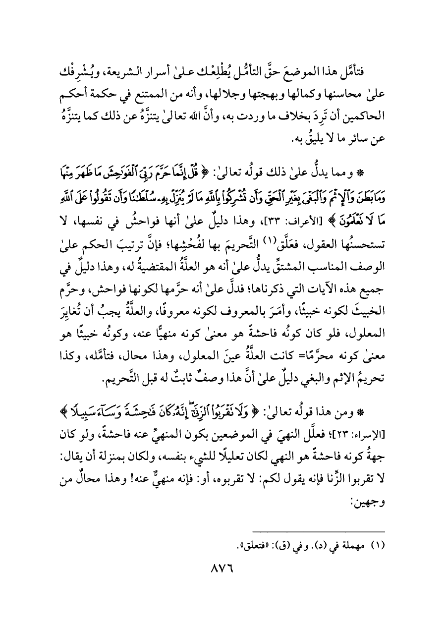 * ومن هذا قولُه تعالى: {وَلَا تَقْرَبُوا الزِّنَا إِنَّهُ كَانَ فَاحِشَةً وَسَاءَ سَبِيلًا} [الإسراء: ٢٣]؛ فعلَّل النهيَ في الموضعين بكون المنهيِّ عنه فاحشةً، ولو كان جهةُ كونه فاحشةً هو النهي لكان تعليلًا للشيء بنفسه، ولكان بمنزلة أن يقال: لا تقربوا الزِّنا فإنه يقول لكم: لا تقربوه، أو: فإنه منهيٌّ عنه! وهذا محالٌ من وجهين: