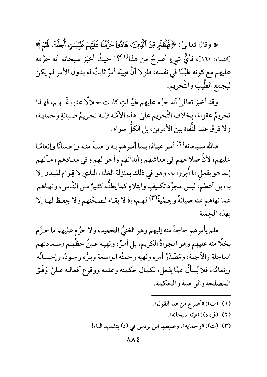 وقد أخبَر تعالى أنه حرَّم عليهم طيِّباتٍ كانت حلالًا عقوبةً لهم، فهذا تحريمُ عقوبة، بخلاف التَّحريم على هذه الأمَّة فإنه تحريمُ صيانةٍ وحماية، ولا فرق عند النُّفاة بين الأمرين، بل الكلُّ سواء.