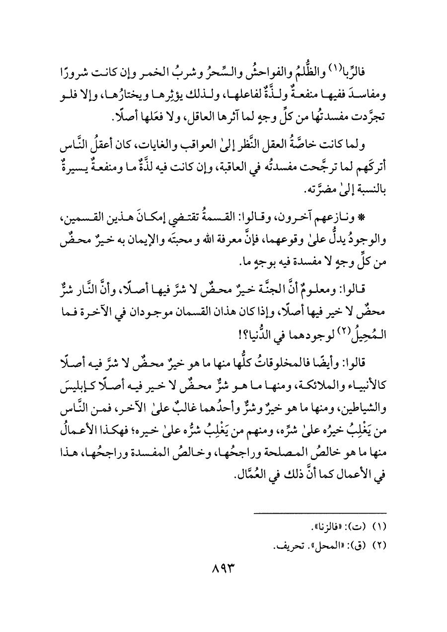 * ونازعهم آخرون، وقالوا: القسمةُ تقتضي إمكانَ هذين القسمين، والوجودُ يدلُّ على وقوعهما، فإنَّ معرفة الله ومحبتَه والإيمان به خيرٌ محضٌ من كلِّ وجهٍ لا مفسدة فيه بوجهٍ ما.