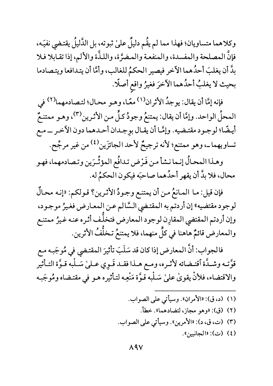 فإنه إمَّا أن يقال: يوجدُ الأثران (¬١) معًا، وهو محال؛ لتصادمهما (¬٢) في المحلِّ الواحد. وإمَّا أن يقال: يمتنعُ وجودُ كلٍّ من الأثرين (¬٣)، وهو ممتنعٌ أيضًا؛ لوجود مقتضيه. وإمَّا أن يقال بوِجدان أحدهما دون الآخر ــ مع تساويهما ــ، وهو ممتنع؛ لأنه ترجيحٌ لأحد الجائزَين (¬٤) من غير مرجِّح.