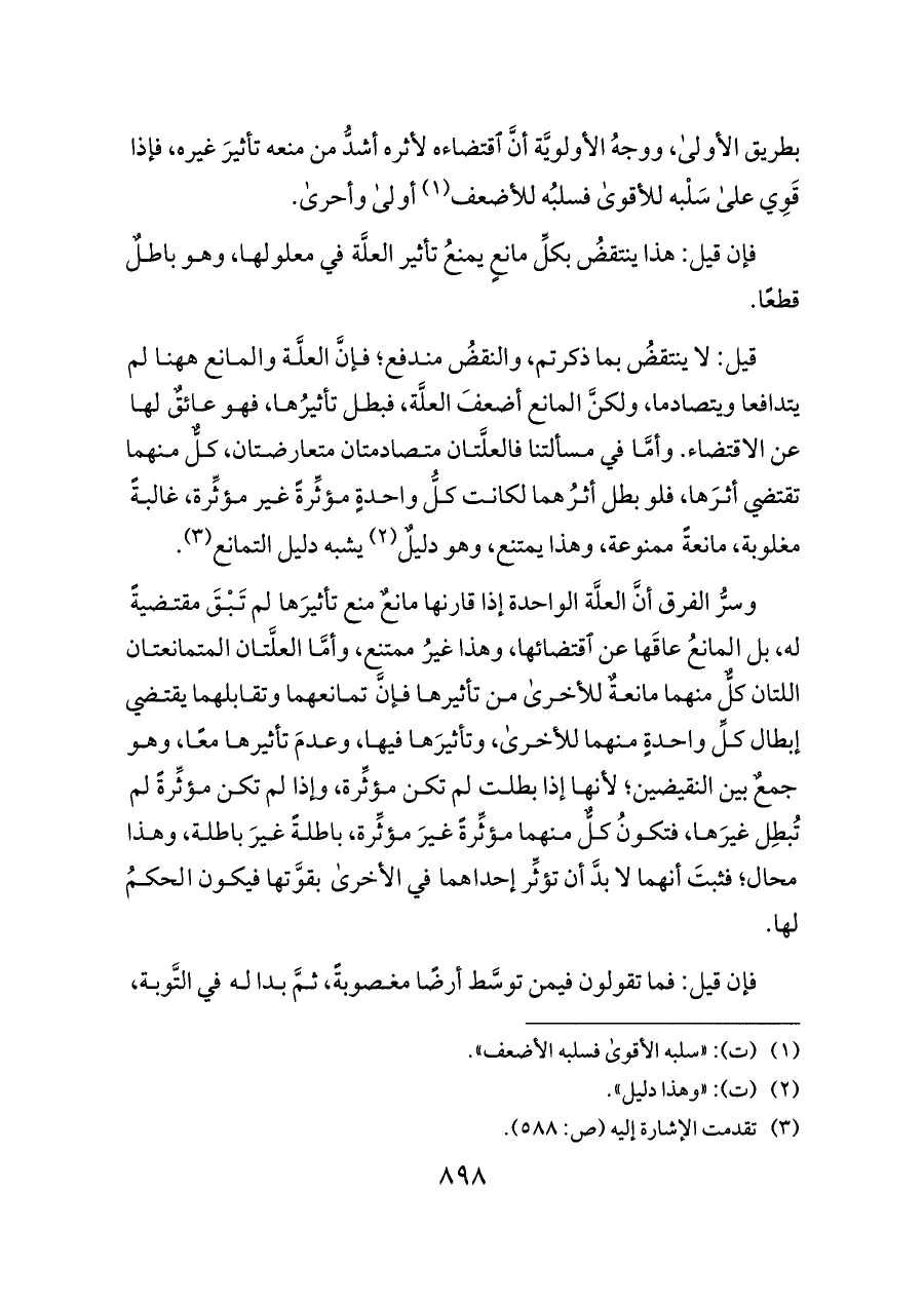 قيل: لا ينتقضُ بما ذكرتم، والنقضُ مندفع؛ فإنَّ العلَّة والمانع ههنا لم يتدافعا ويتصادما، ولكنَّ المانع أضعفَ العلَّة، فبطل تأثيرُها، فهو عائقٌ لها عن الاقتضاء. وأمَّا في مسألتنا فالعلَّتان متصادمتان متعارضتان، كلٌّ منهما تقتضي أثرَها، فلو بطل أثرُهما لكانت كلُّ واحدةٍ مؤثِّرةً غير مؤثِّرة، غالبةً مغلوبة، مانعةً ممنوعة، وهذا يمتنع، وهو دليلٌ (¬٢) يشبه دليل التمانع (¬٣).