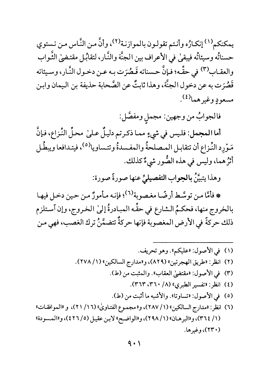 يمكنكم (¬١) إنكارُه وأنتم تقولون بالموازنة (¬٢)، وأنَّ من النَّاس من تستوي حسناتُه وسيئاتُه فيبقى في الأعراف بين الجنَّة والنَّار، لتقابُل مقتضى الثَّواب والعقاب (¬٣) في حقِّه؛ فإنَّ حسناته قَصُرَت به عن دخول النَّار، وسيئاته قَصُرَت به عن دخول الجنَّة، وهذا ثابتٌ عن الصَّحابة حذيفة بن اليمان وابن مسعودٍ وغيرهما (¬٤).