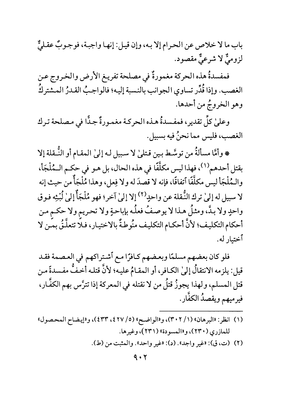 فمفسدةُ هذه الحركة مغمورةٌ في مصلحة تفريغ الأرض والخروج عن الغصب. وإذا قُدِّر تساوي الجوانب بالنسبة إليه؛ فالواجبُ القدرُ المشتركُ وهو الخروجُ من أحدها.
