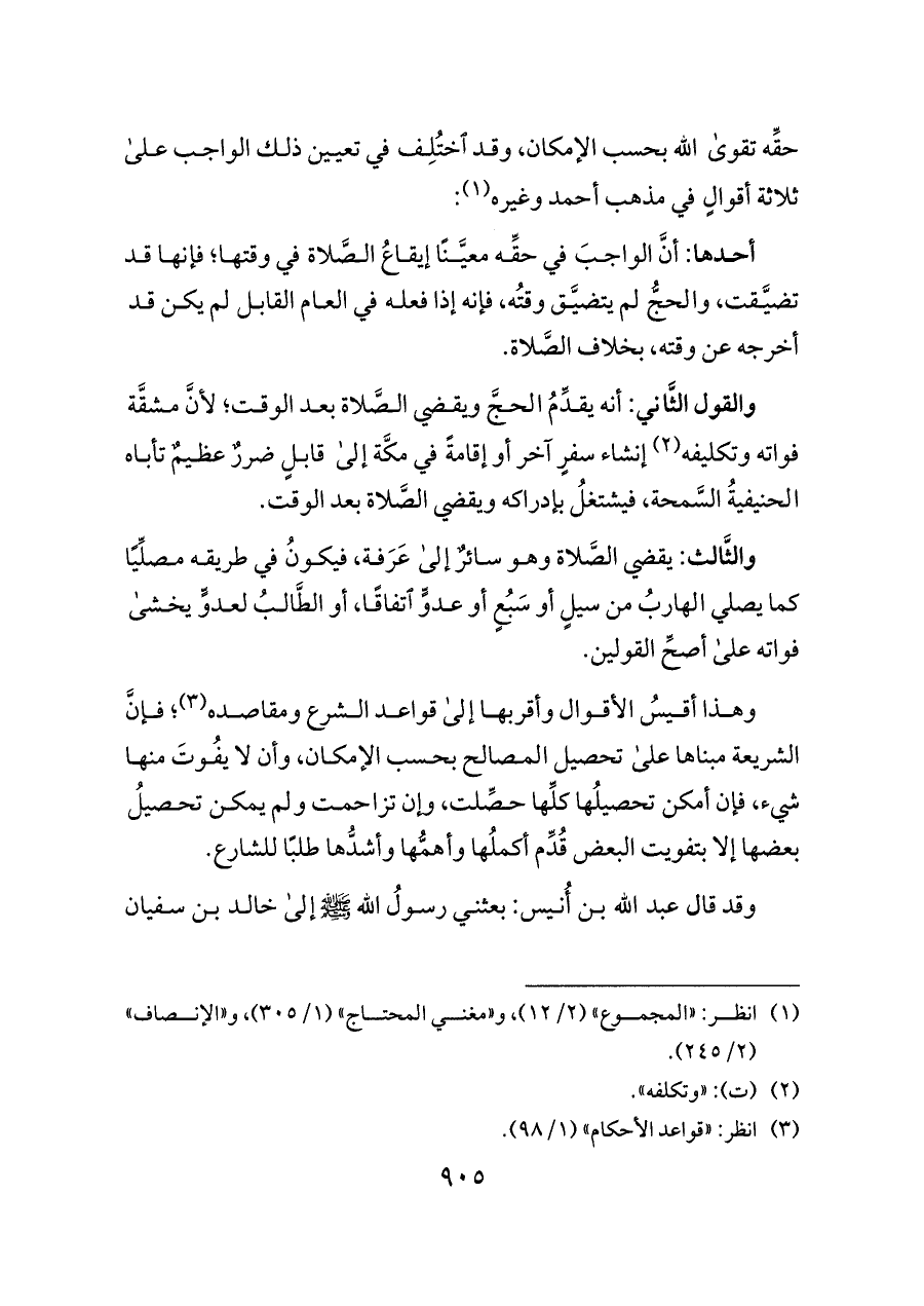 والقول الثَّاني: أنه يقدِّمُ الحجَّ ويقضي الصَّلاة بعد الوقت؛ لأنَّ مشقَّة فواته وتكليفه (¬٢) إنشاء سفرٍ آخر أو إقامةً في مكَّة إلى قابلٍ ضررٌ عظيمٌ تأباه الحنيفيةُ السَّمحة، فيشتغلُ بإدراكه ويقضي الصَّلاة بعد الوقت.