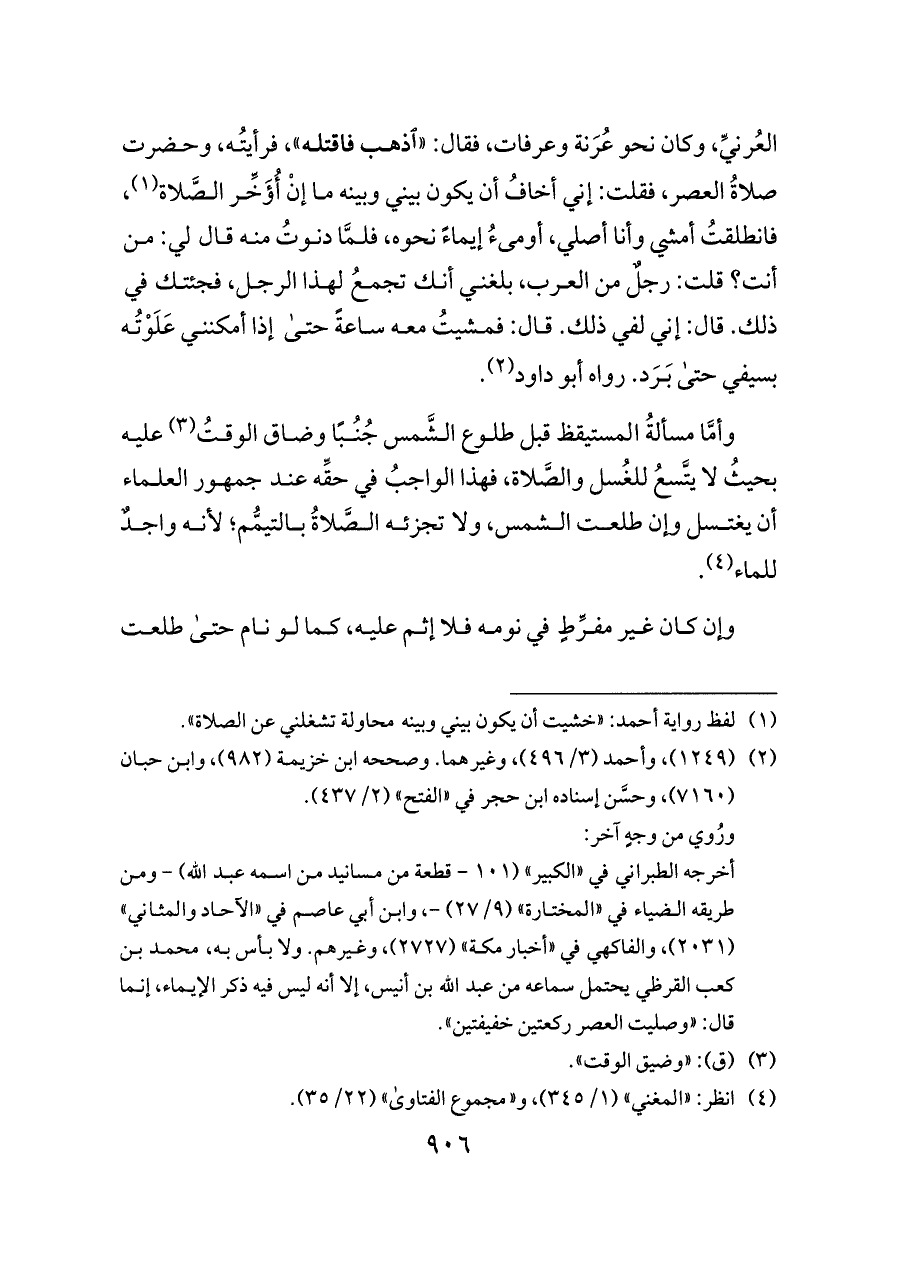 العُرنيِّ، وكان نحو عُرَنة وعرفات، فقال: «اذهب فاقتله»، فرأيتُه، وحضرت صلاةُ العصر، فقلت: إني أخافُ أن يكون بيني وبينه ما إنْ أُؤَخِّر الصَّلاة (¬١)، فانطلقتُ أمشي وأنا أصلي، أوماءُ إيماءً نحوه، فلمَّا دنوتُ منه قال لي: من أنت؟ قلت: رجلٌ من العرب، بلغني أنك تجمعُ لهذا الرجل، فجئتك في ذلك. قال: إني لفي ذلك. قال: فمشيتُ معه ساعةً حتى إذا أمكنني عَلَوْتُه بسيفي حتى بَرَد. رواه أبو داود (¬٢).