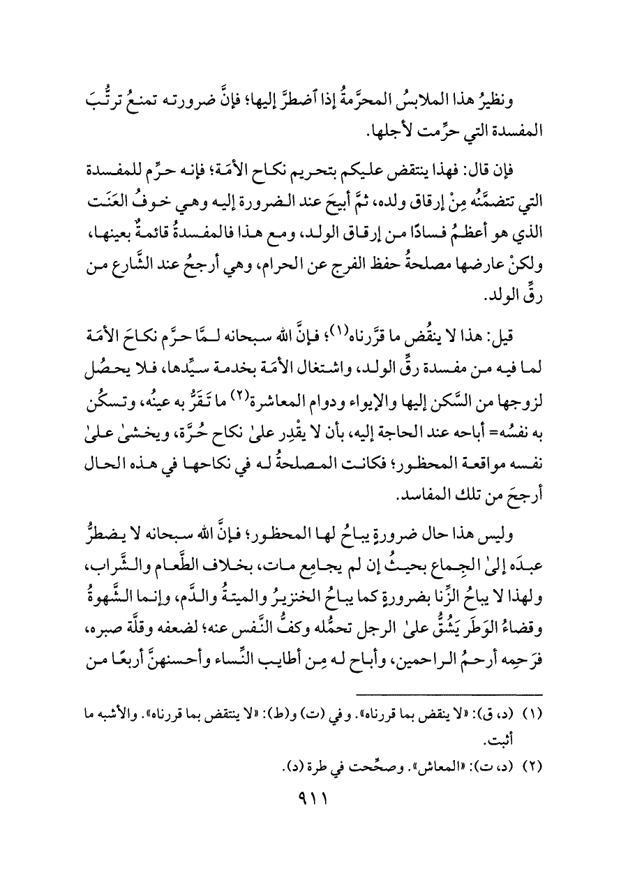 فإن قال: فهذا ينتقض عليكم بتحريم نكاح الأمَة؛ فإنه حرِّم للمفسدة التي تتضمَّنُه مِنْ إرقاق ولده، ثمَّ أبيحَ عند الضرورة إليه وهي خوفُ العَنَت الذي هو أعظمُ فسادًا من إرقاق الولد، ومع هذا فالمفسدةُ قائمةٌ بعينها، ولكنْ عارضها مصلحةُ حفظ الفرج عن الحرام، وهي أرجحُ عند الشَّارع من رقِّ الولد.