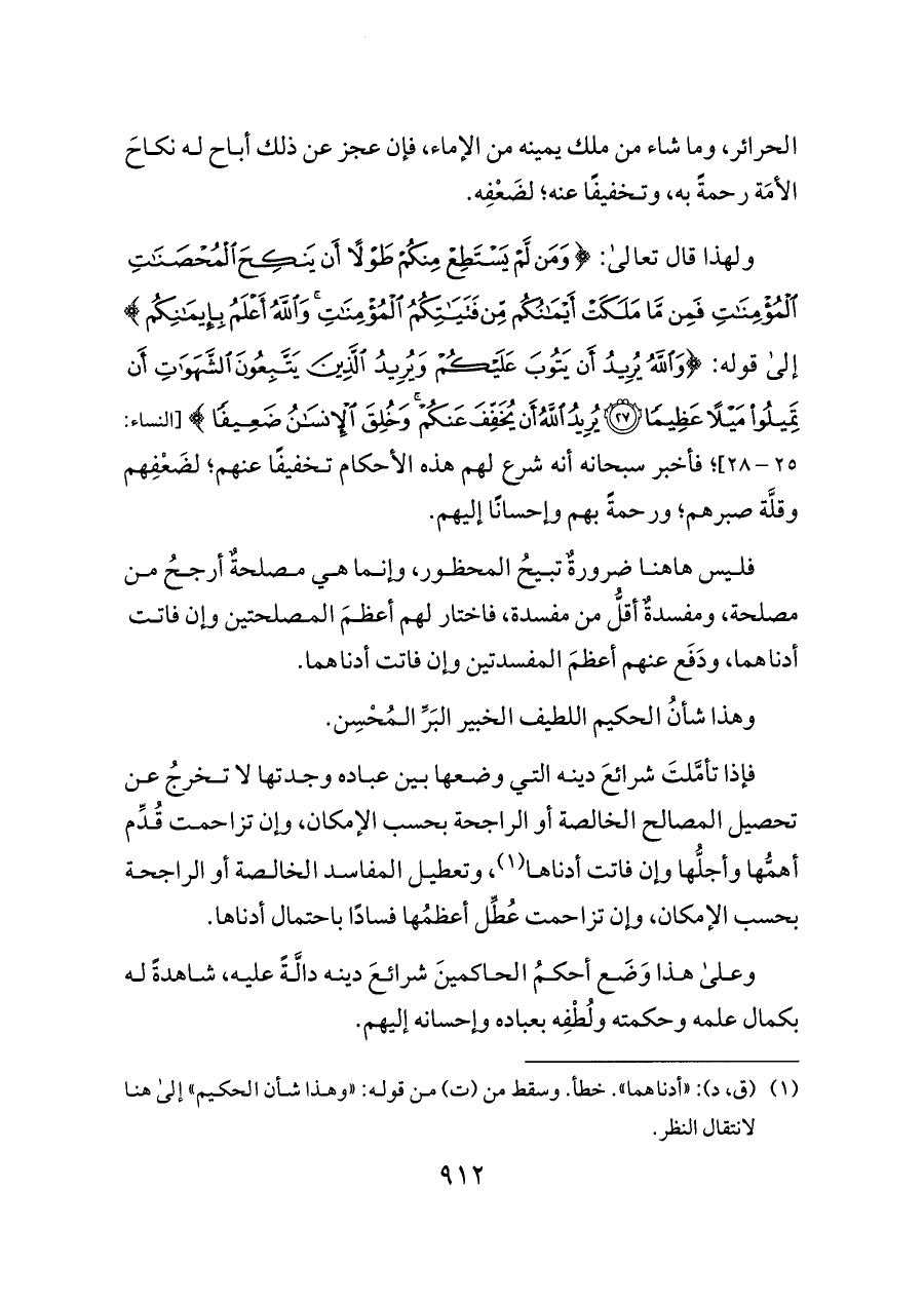 ولهذا قال تعالى: {وَمَنْ لَمْ يَسْتَطِعْ مِنْكُمْ طَوْلًا أَنْ يَنْكِحَ الْمُحْصَنَاتِ الْمُؤْمِنَاتِ فَمِنْ مَا مَلَكَتْ أَيْمَانُكُمْ مِنْ فَتَيَاتِكُمُ الْمُؤْمِنَاتِ وَاللَّهُ أَعْلَمُ بِإِيمَانِكُمْ} إلى قوله: {وَاللَّهُ يُرِيدُ أَنْ يَتُوبَ عَلَيْكُمْ وَيُرِيدُ الَّذِينَ يَتَّبِعُونَ الشَّهَوَاتِ أَنْ تَمِيلُوا مَيْلًا عَظِيمًا (٢٧) يُرِيدُ اللَّهُ أَنْ يُخَفِّفَ عَنْكُمْ وَخُلِقَ الْإِنْسَانُ ضَعِيفًا} [النساء: ٢٥ - ٢٨]؛ فأخبر سبحانه أنه شرع لهم هذه الأحكام تخفيفًا عنهم؛ لضَعْفِهم وقلَّة صبرهم؛ ورحمةً بهم وإحسانًا إليهم.