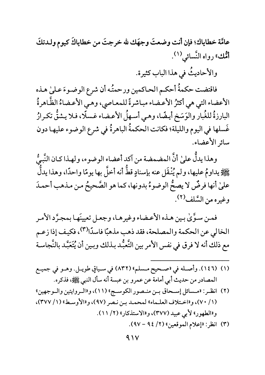 فاقتضت حكمةُ أحكم الحاكمين ورحمتُه أن شرع الوضوءَ على هذه الأعضاء التي هي أكثرُ الأعضاء مباشرةً للمعاصي، وهي الأعضاءُ الظَّاهرةُ البارزةُ للغُبار والوَسَخ أيضًا، وهي أسهلُ الأعضاء غسلًا، فلا يشقُّ تكرارُ غَسلها في اليوم والليلة؛ فكانت الحكمةُ الباهرةُ في شرع الوضوء عليها دون سائر الأعضاء.