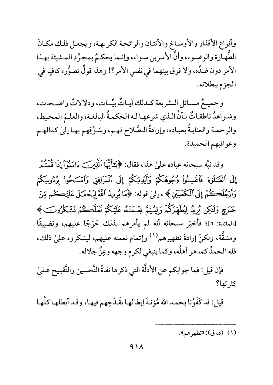 وأنواع الأقذار والأوساخ والأنتان والرائحة الكريهة، ويجعل ذلك مكانَ الطَّهارة والوضوء، وأنَّ الأمرين سواء، وإنما يحكمُ بمجرَّد المشيئة بهذا الأمر دون ضدِّه، ولا فرق بينهما في نفسِ الأمر؟! وهذا قولٌ تصوُّره كافٍ في الجزم ببطلانه.