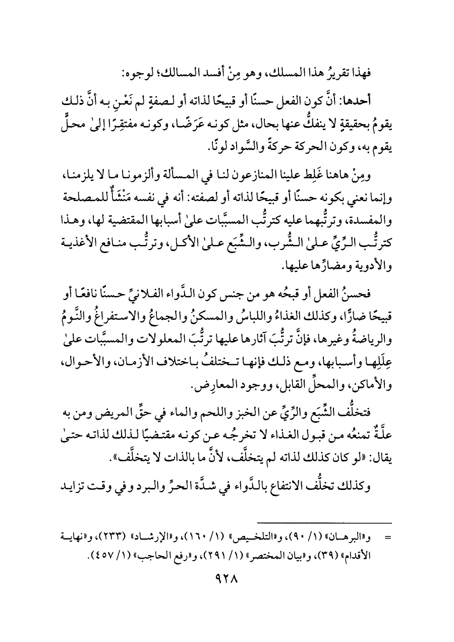 ومِنْ هاهنا غَلِط علينا المنازعون لنا في المسألة وألزمونا ما لا يلزمنا، وإنما نعني بكونه حسنًا أو قبيحًا لذاته أو لصفته: أنه في نفسه مَنْشَأٌ للمصلحة والمفسدة، وترتُّبهما عليه كترتُّب المسبَّبات على أسبابها المقتضية لها، وهذا كترتُّب الرِّيِّ على الشُّرب، والشِّبَع على الأكل، وترتُّب منافع الأغذية والأدوية ومضارِّها عليها.