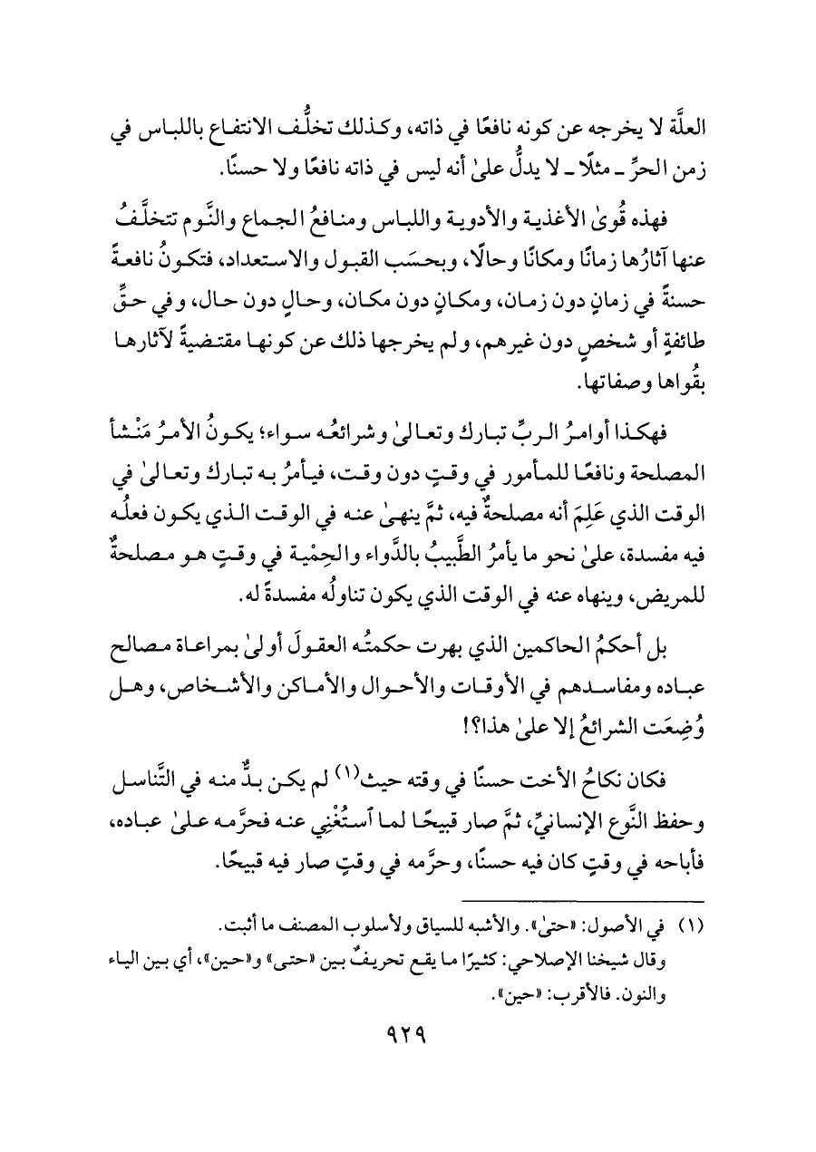 العلَّة لا يخرجه عن كونه نافعًا في ذاته، وكذلك تخلُّف الانتفاع باللباس في زمن الحرِّ ــ مثلًا ــ لا يدلُّ على أنه ليس في ذاته نافعًا ولا حسنًا.