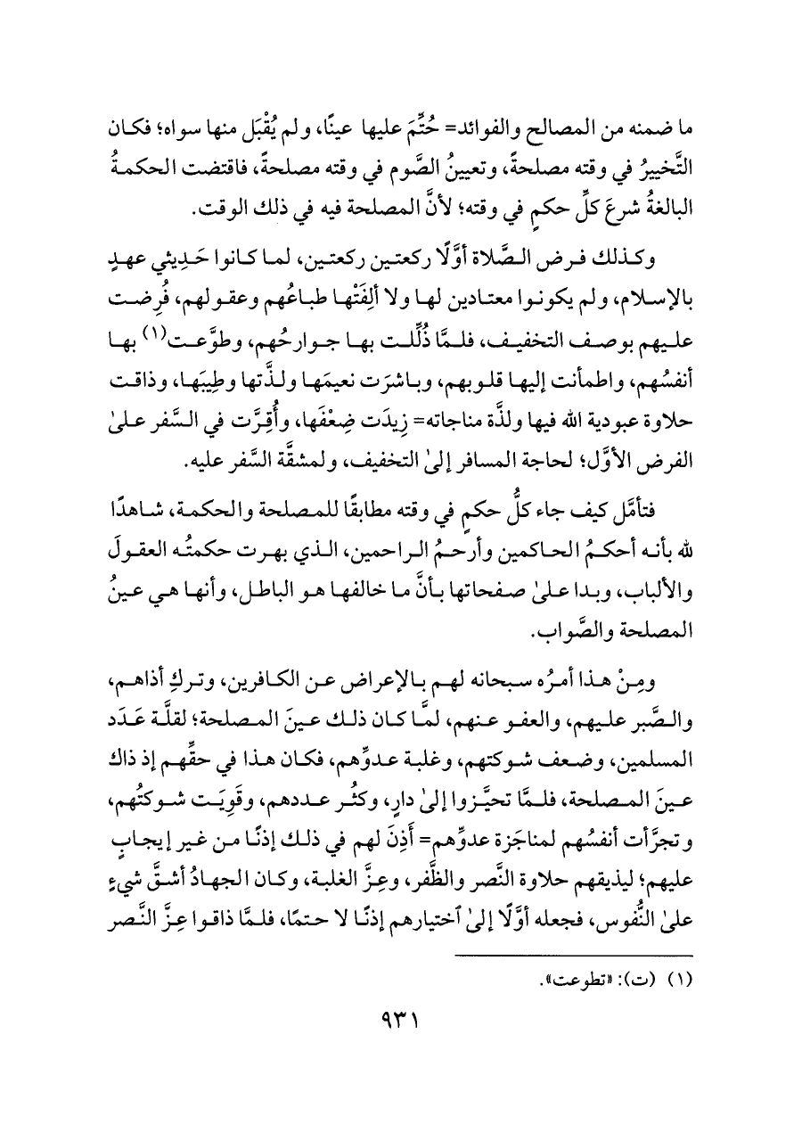 ومِنْ هذا أمرُه سبحانه لهم بالإعراض عن الكافرين، وتركِ أذاهم، والصَّبر عليهم، والعفو عنهم، لمَّا كان ذلك عينَ المصلحة؛ لقلَّة عَدَد المسلمين، وضعف شوكتهم، وغلبة عدوِّهم، فكان هذا في حقِّهم إذ ذاك عينَ المصلحة، فلمَّا تحيَّزوا إلى دارٍ، وكثُر عددهم، وقَوِيَت شوكتُهم، وتجرَّأت أنفسُهم لمناجَزة عدوِّهم= أَذِنَ لهم في ذلك إذنًا من غير إيجابٍ عليهم؛ ليذيقهم حلاوة النَّصر والظَّفر، وعِزَّ الغلبة، وكان الجهادُ أشقَّ شيءٍ على النُّفوس، فجعله أوَّلًا إلى اختيارهم إذنًا لا حتمًا، فلمَّا ذاقوا عِزَّ النَّصر