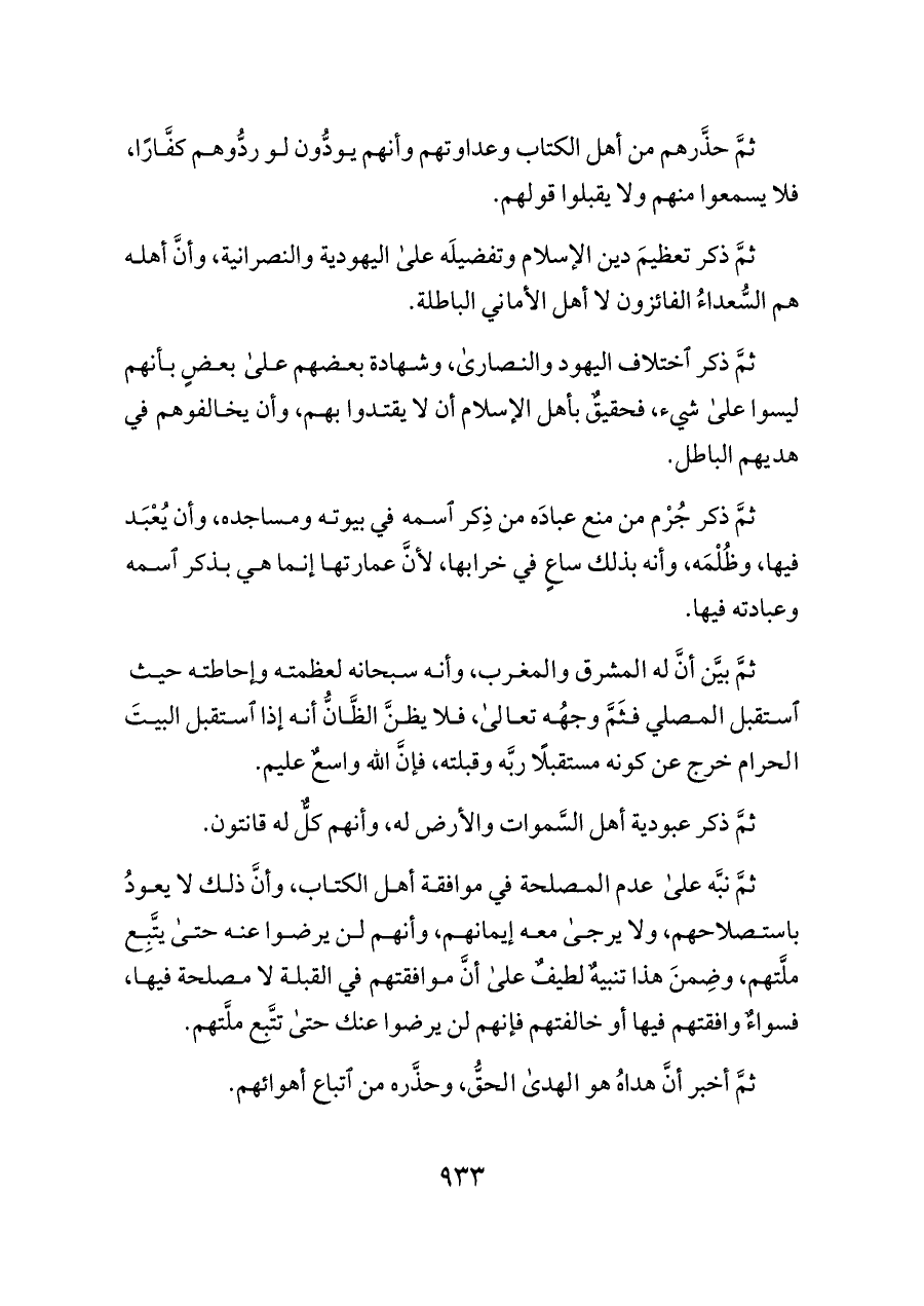 ثمَّ ذكر تعظيمَ دين الإسلام وتفضيلَه على اليهودية والنصرانية، وأنَّ أهله هم السُّعداءُ الفائزون لا أهل الأماني الباطلة.