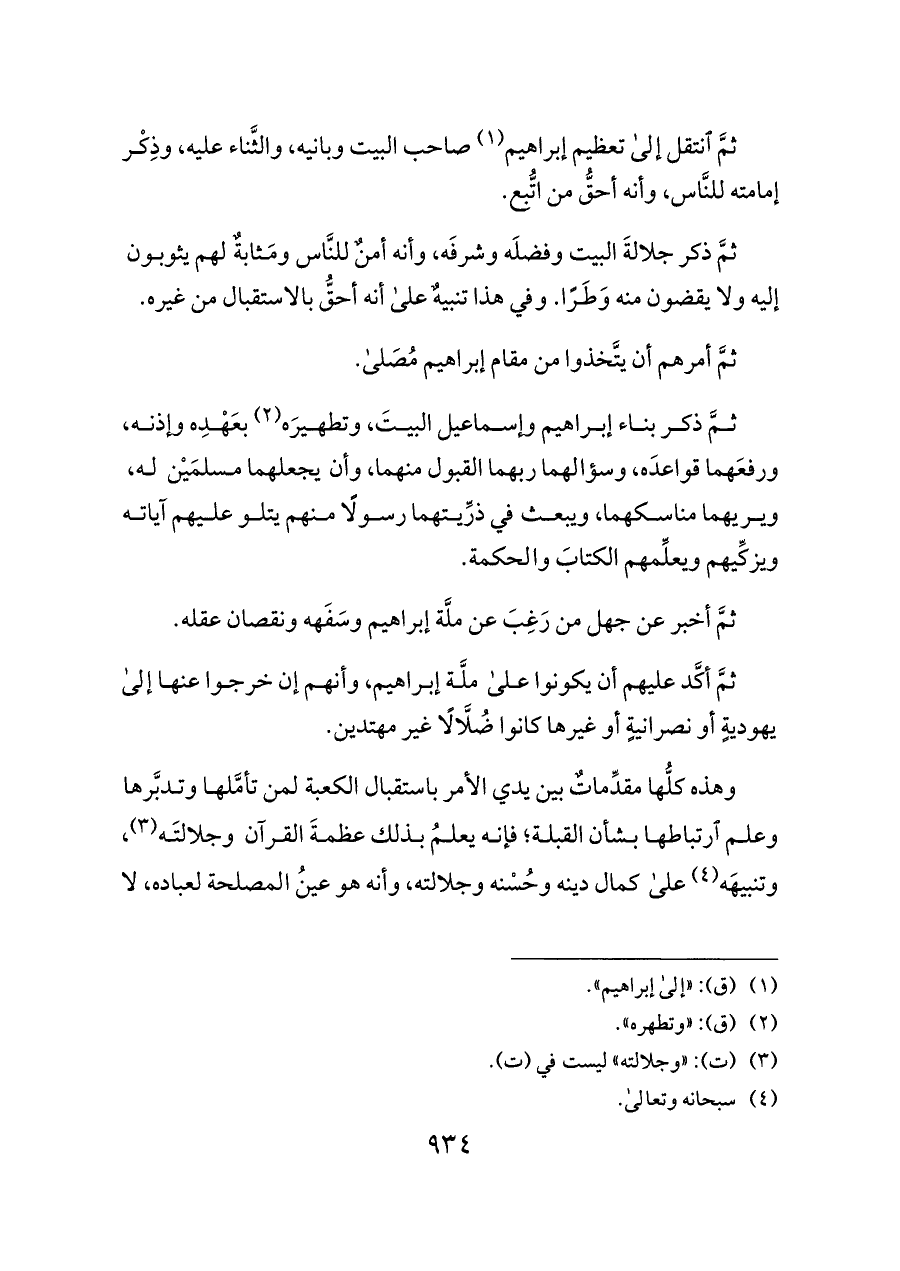 ثمَّ انتقل إلى تعظيم إبراهيم (¬١) صاحب البيت وبانيه، والثَّناء عليه، وذِكْر إمامته للنَّاس، وأنه أحقُّ من اتُّبِع.