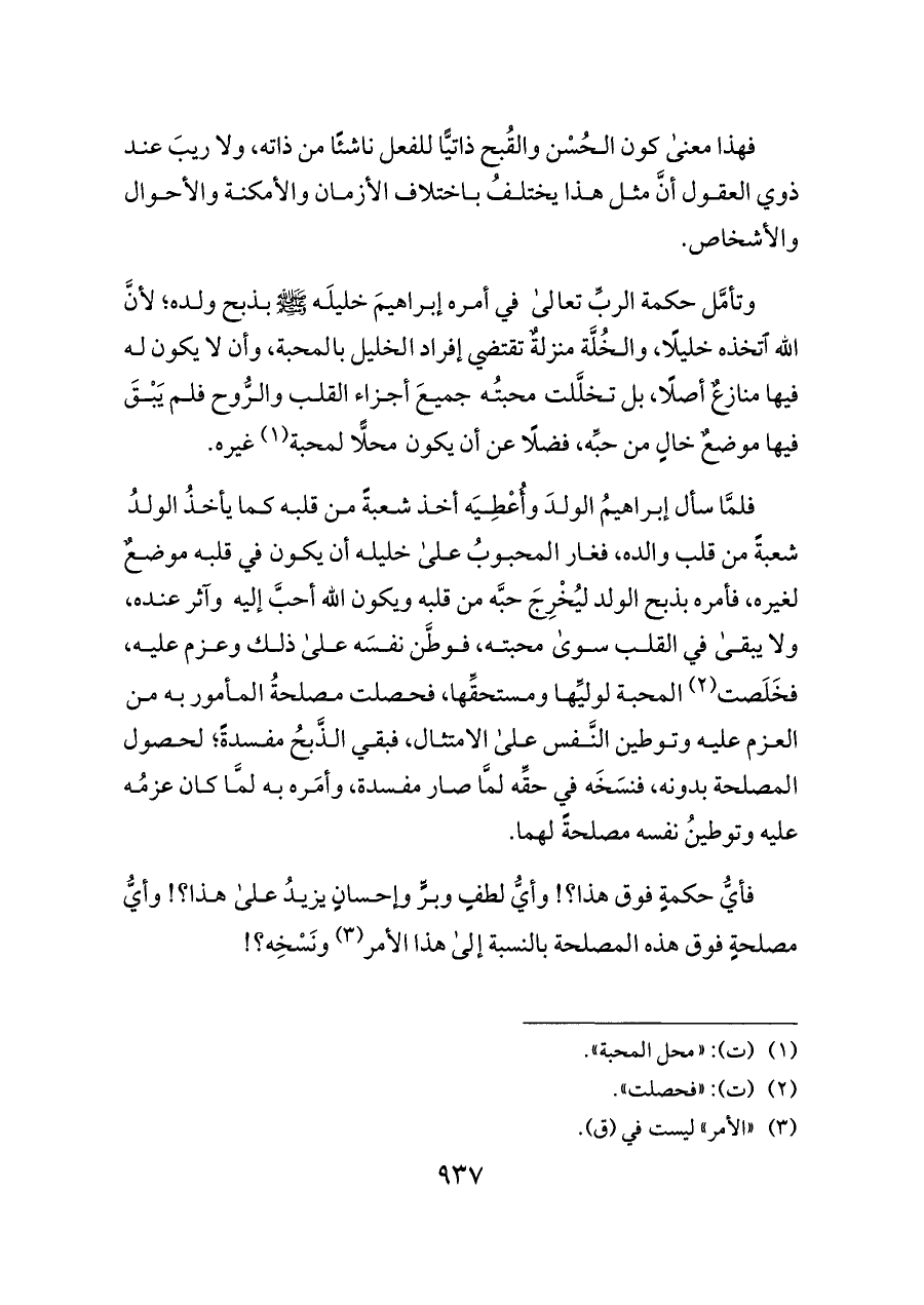 وتأمَّل حكمة الربِّ تعالى في أمره إبراهيمَ خليلَه - صلى الله عليه وسلم - بذبح ولده؛ لأنَّ الله ا تخذه خليلًا، والخُلَّة منزلةٌ تقتضي إفراد الخليل بالمحبة، وأن لا يكون له فيها منازعٌ أصلًا، بل تخلَّلت محبتُه جميعَ أجزاء القلب والرُّوح فلم يَبْقَ فيها موضعٌ خالٍ من حبِّه، فضلًا عن أن يكون محلًّا لمحبة (¬١) غيره.