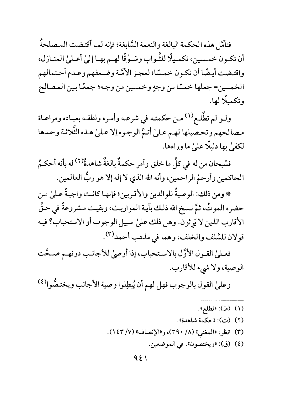 * ومن ذلك: الوصيةُ للوالدين والأقربين؛ فإنها كانت واجبةً على من حضره الموتُ، ثمَّ نسخ الله ذلك بآية المواريث، وبقيت مشروعةً في حقِّ الأقارب الذين لا يَرِثون. وهل ذلك على سبيل الوجوب أو الاستحباب؟ فيه قولان للسَّلف والخلف، وهما في مذهب أحمد (¬٣).