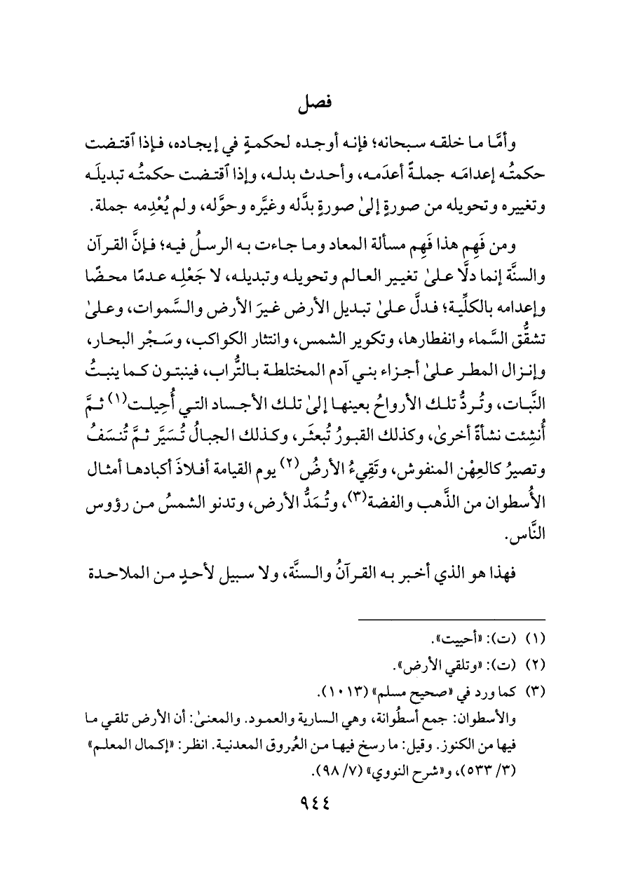 ومن فَهِم هذا فَهِم مسألة المعاد وما جاءت به الرسلُ فيه؛ فإنَّ القرآن والسنَّة إنما دلَّا على تغيير العالم وتحويله وتبديله، لا جَعْلِه عدمًا محضًا وإعدامه بالكلِّية؛ فدلَّ على تبديل الأرض غيرَ الأرض والسَّموات، وعلى تشقُّق السَّماء وانفطارها، وتكوير الشمس، وانتثار الكواكب، وسَجْر البحار، وإنزال المطر على أجزاء بني آدم المختلطة بالتُّراب، فينبتون كما ينبتُ النَّبات، وتُردُّ تلك الأرواحُ بعينها إلى تلك الأجساد التي أُحِيلت (¬١) ثمَّ أُنشِئت نشأةً أخرى، وكذلك القبورُ تُبعثَر، وكذلك الجبالُ تُسَيَّر ثمَّ تُنسَفُ وتصيرُ كالعِهْن المنفوش، وتَقِيءُ الأرضُ (¬٢) يوم القيامة أفلاذَ أكبادها أمثال الأُسطوان من الذَّهب والفضة (¬٣)، وتُمَدُّ الأرض، وتدنو الشمسُ من رؤوس النَّاس.