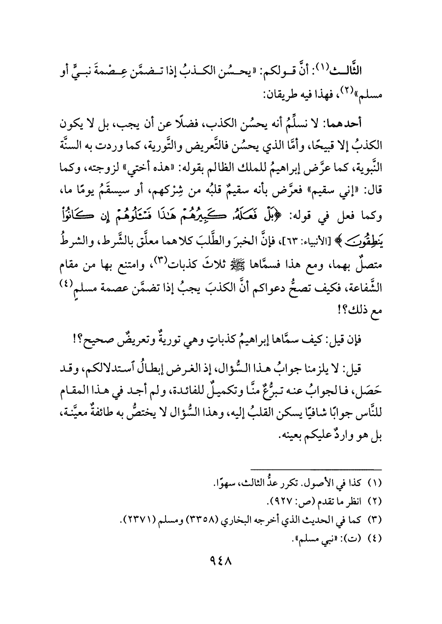 الثَّالث (¬١): أنَّ قولكم: «يحسُن الكذبُ إذا تضمَّن عِصْمةَ نبيٍّ أو مسلم» (¬٢)، فهذا فيه طريقان: