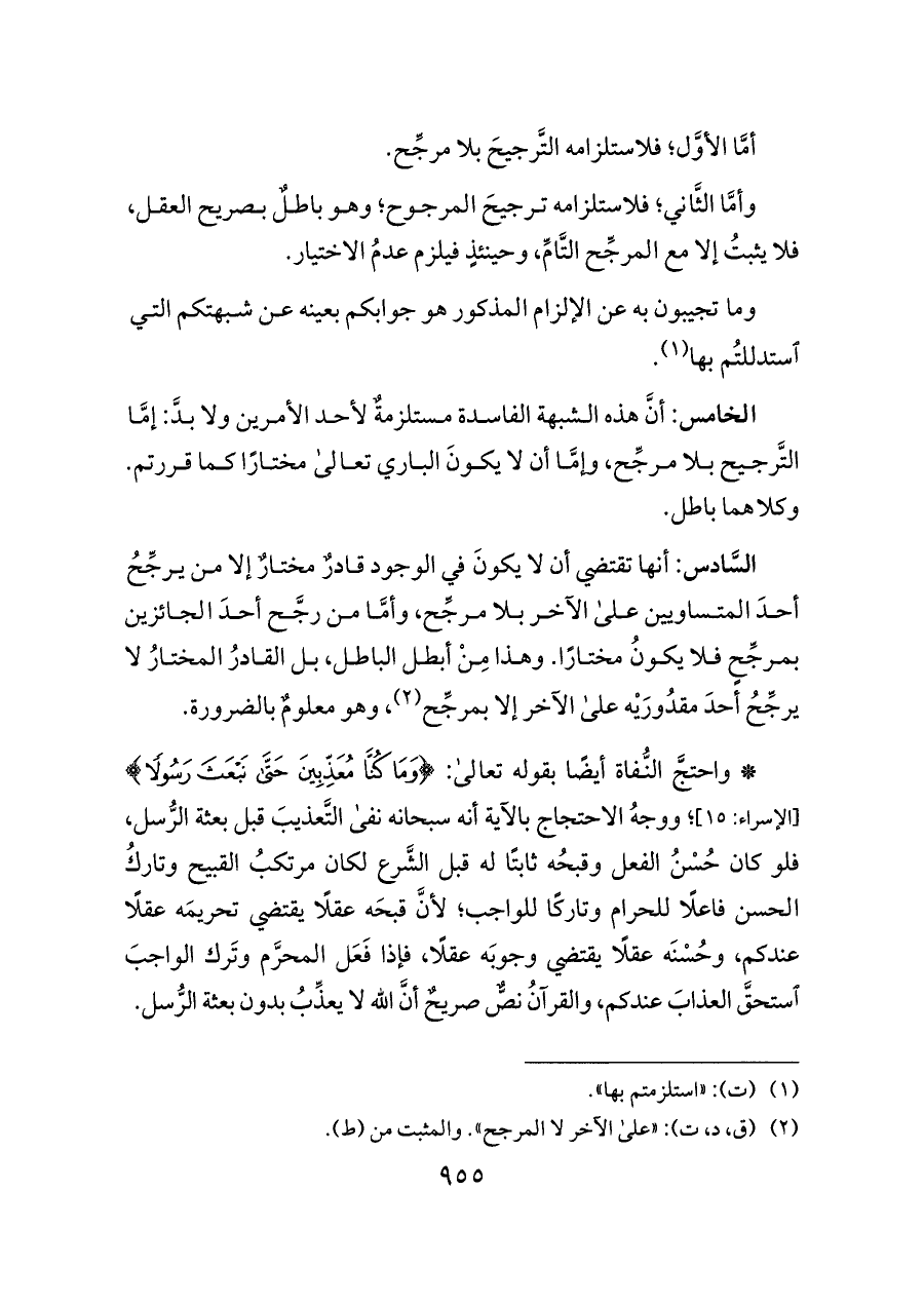 الخامس: أنَّ هذه الشبهة الفاسدة مستلزمةٌ لأحد الأمرين ولا بدَّ: إمَّا التَّرجيح بلا مرجِّح، وإمَّا أن لا يكونَ الباري تعالى مختارًا كما قررتم. وكلاهما باطل.