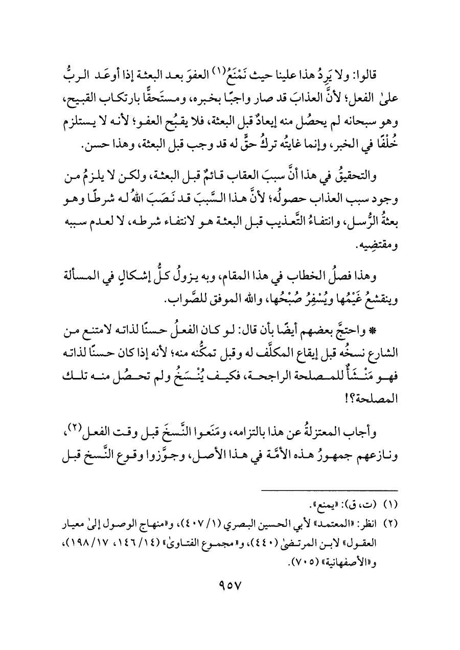 (¬٢) انظر: «المعتمد» لأبي الحسين البصري (١/ ٤٠٧)، و «منهاج الوصول إلى معيار العقول» لابن المرتضى (٤٤٠)، و «مجموع الفتاوى» (١٤/ ١٤٦، ١٧/ ١٩٨)، و «الأصفهانية» (٧٠٥).