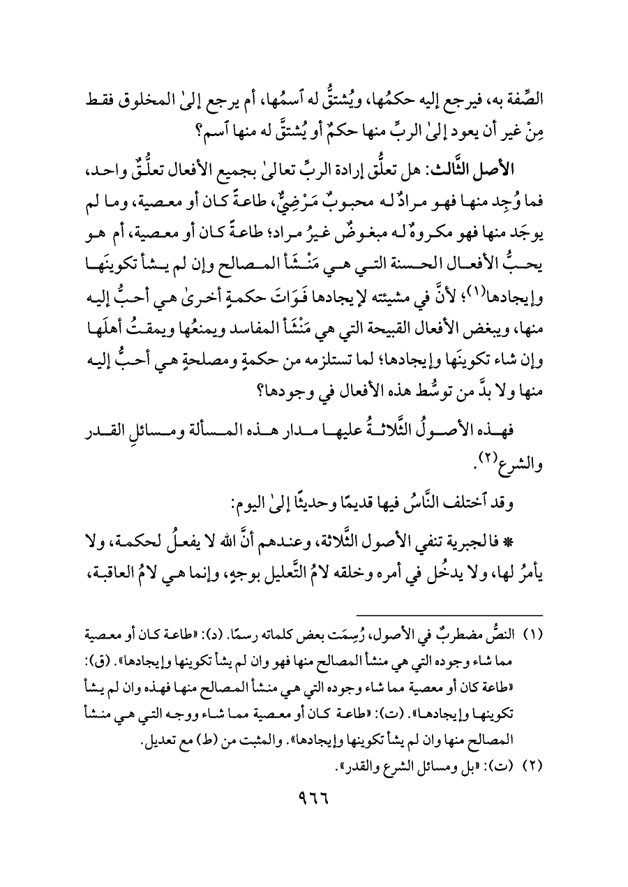 فهذه الأصولُ الثَّلاثةُ عليها مدار هذه المسألة ومسائلِ القدر والشرع (¬٢).