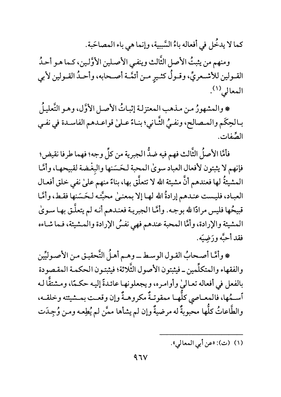ومنهم من يثبتُ الأصل الثَّالث وينفي الأصلين الأوَّلين، كما هو أحدُ القولين للأشعريِّ، وقولُ كثيرٍ من أئمَّة أصحابه، وأحدُ القولين لأبي المعالي (¬١).