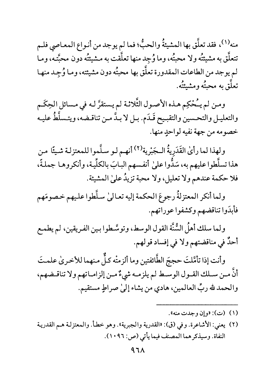 (¬٢) يعني: الأشاعرة. وفي (ق): «القدرية والجبرية». وهو خطأ. والمعتزلة هم القدرية النفاة. وسيذكرهما المصنف فيما يأتي (ص: ١٠٩٦).