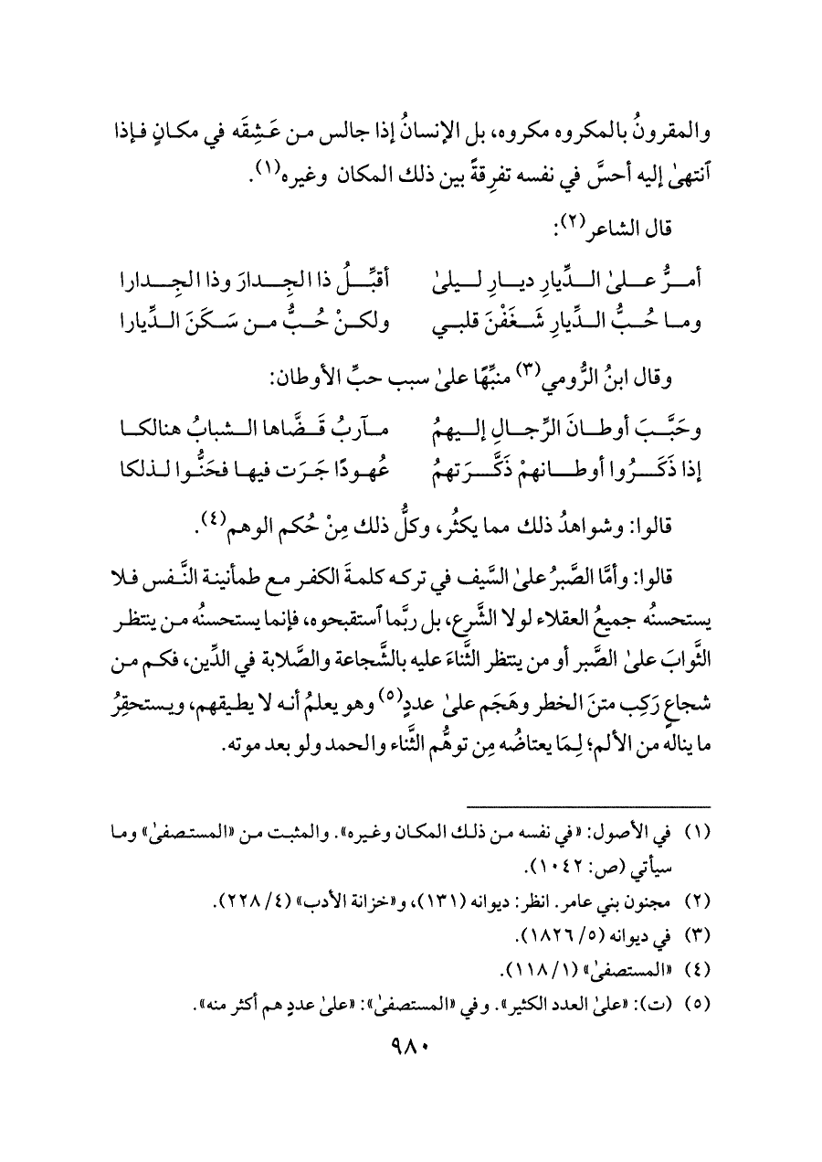 قالوا: وأمَّا الصَّبرُ على السَّيف في تركه كلمةَ الكفر مع طمأنينة النَّفس فلا يستحسنُه جميعُ العقلاء لولا الشَّرع، بل ربَّما استقبحوه، فإنما يستحسنُه من ينتظر الثَّوابَ على الصَّبر أو من ينتظر الثَّناءَ عليه بالشَّجاعة والصَّلابة في الدِّين، فكم من شجاعٍ رَكِب متنَ الخطر وهَجَم على عددٍ (¬٥) وهو يعلمُ أنه لا يطيقهم، ويستحقِرُ ما يناله من الألم؛ لِمَا يعتاضُه مِن توهُّم الثَّناء والحمد ولو بعد موته.