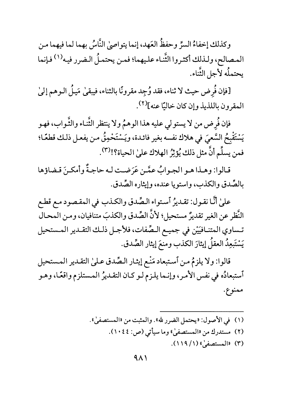 على أنَّا نقول: تقديرُ استواء الصِّدق والكذب في المقصود مع قطع النَّظر عن الغير تقديرٌ مستحيل؛ لأنَّ الصِّدق والكذبَ متنافيان، ومن المحال تساوي المتنافيَيْن في جميع الصِّفات، فلأجل ذلك التقدير المستحيل يَسْتَبعِدُ العقلُ إيثارَ الكذب ومنعَ إيثار الصِّدق.